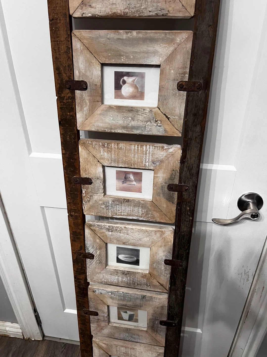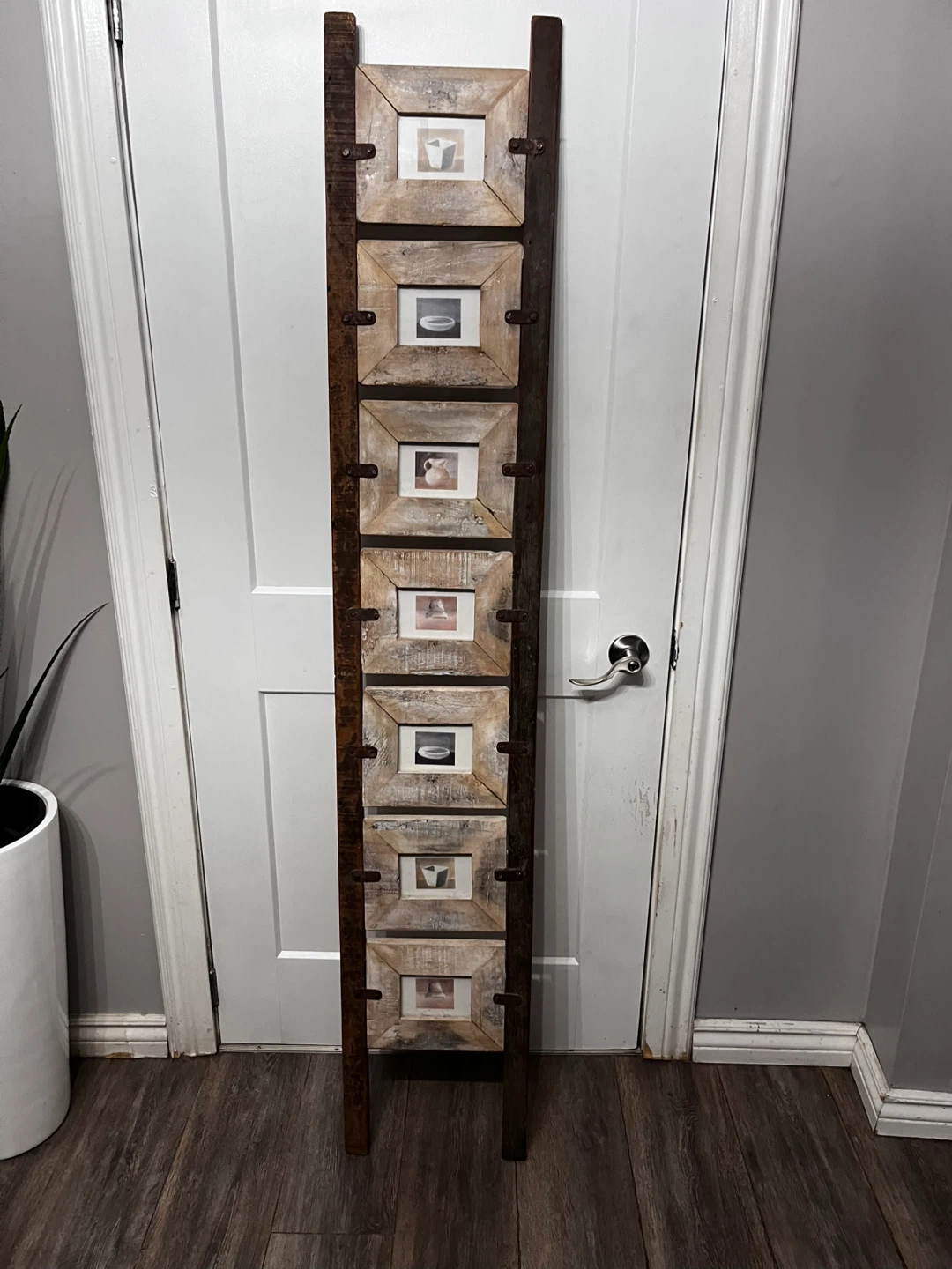 Selling a leaning rustic wooden ladder with attached picture frames. It's a unique piece that adds a touch of vintage charm to any room. Perfect for displaying your favourite photos or artwork! Measures at 68.5” H x 12.25” W. Displays 7 3.5” x 5” picture.