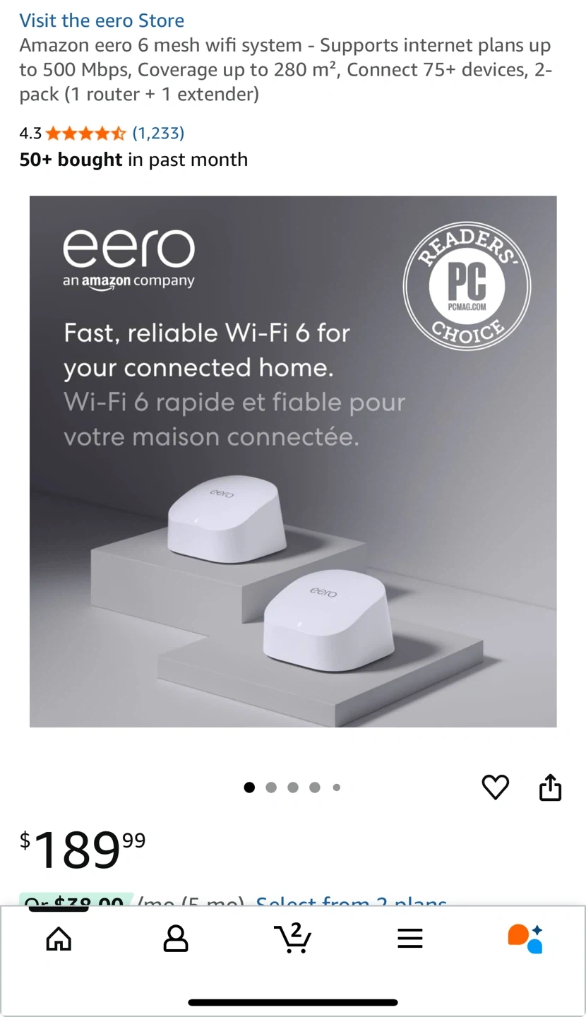 83Selling an eero 6 mesh wifi system. Supports internet plans up to 500 Mbps, with coverage up to 280 m². It can connect 75+ devices. Includes 1 router and 1 extender. Comes with the box and all original components