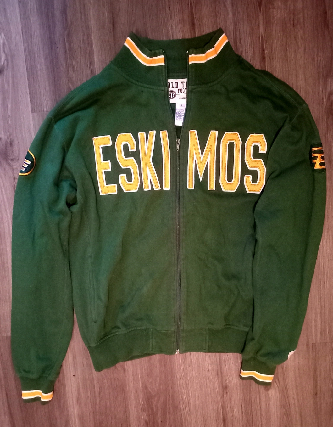 Here's an Old Time Football Edmonton Eskimos jacket in size L. It's a green jacket with yellow and white accents. Perfect for any fan!
