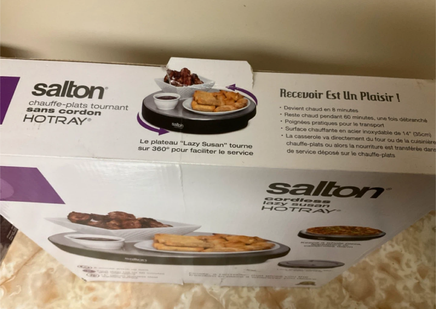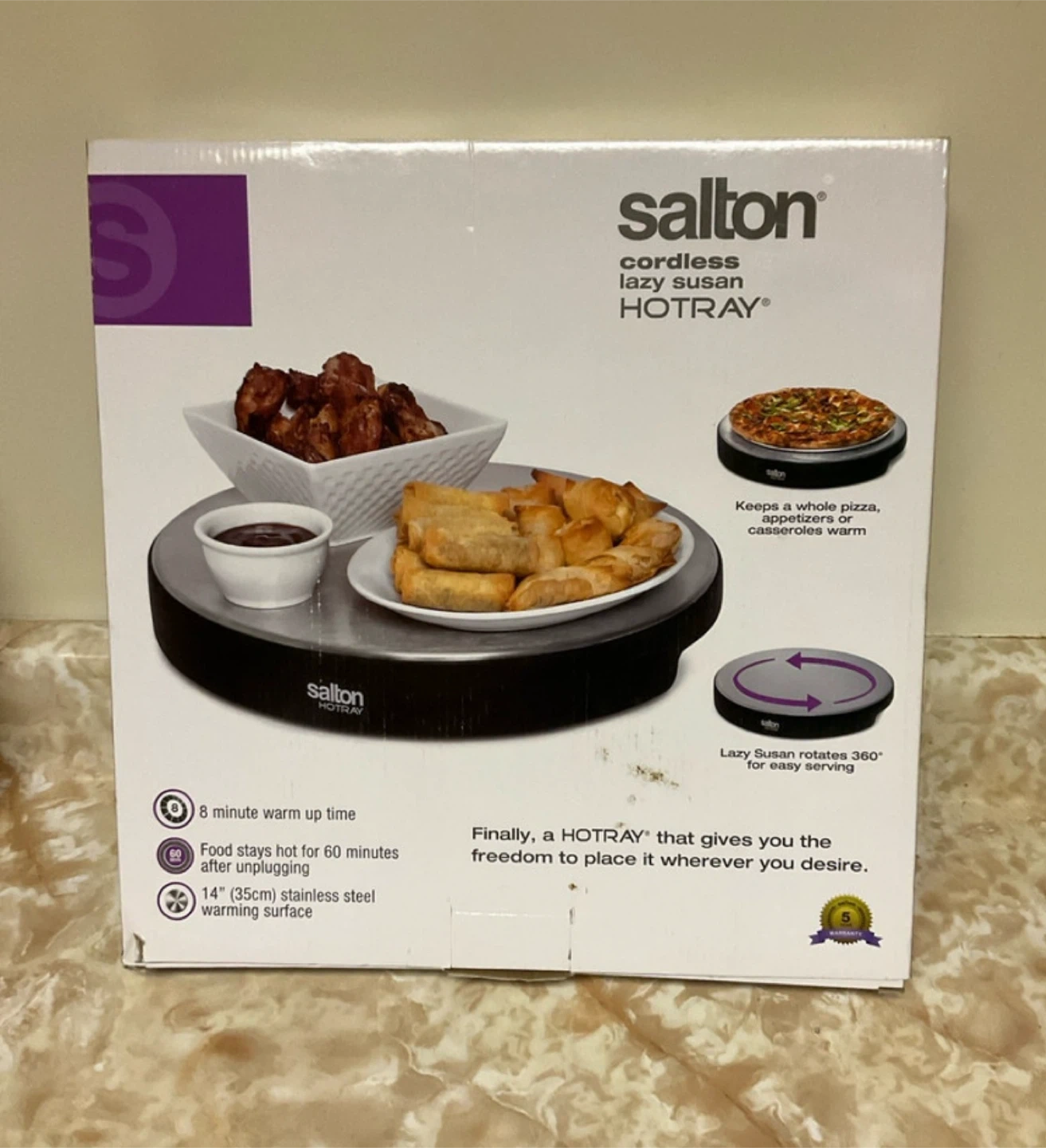 Keep your food warm with this gently used Salton Cordless Lazy Susan Hotray! It features a 14" (35cm) stainless steel warming surface. It keeps food hot for 60 minutes after unplugging and has an 8-minute warm-up time. The lazy susan rotates 360° for easy serving.