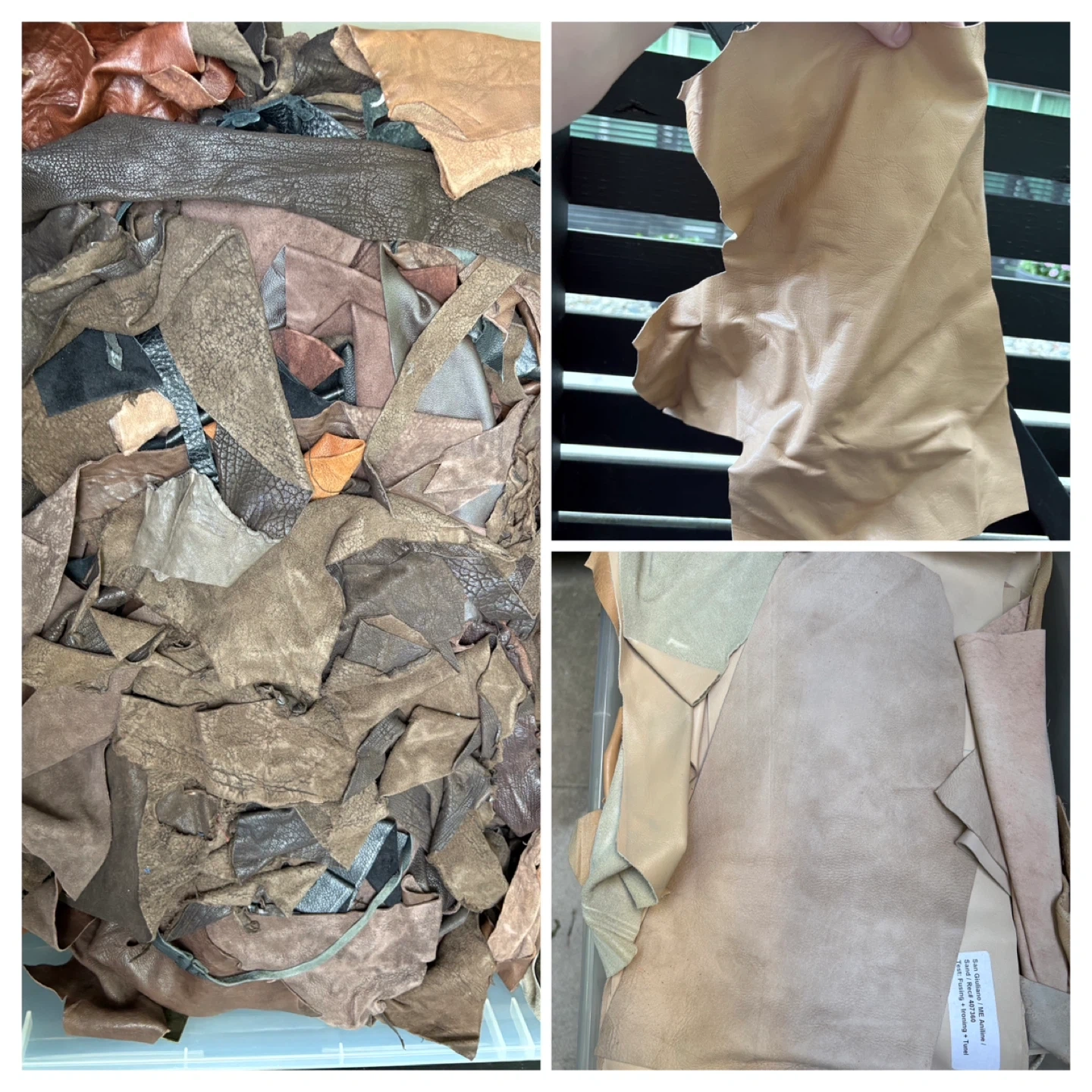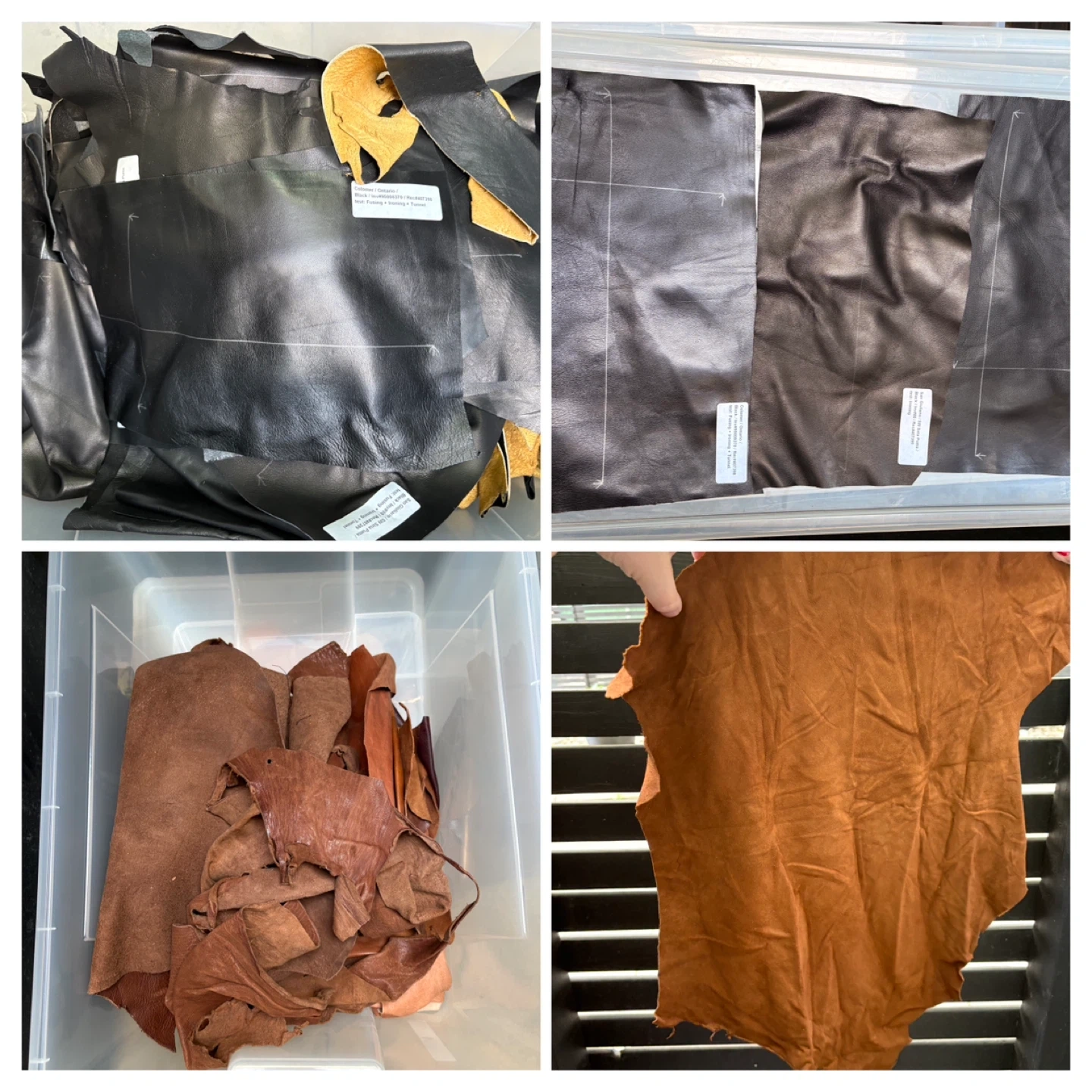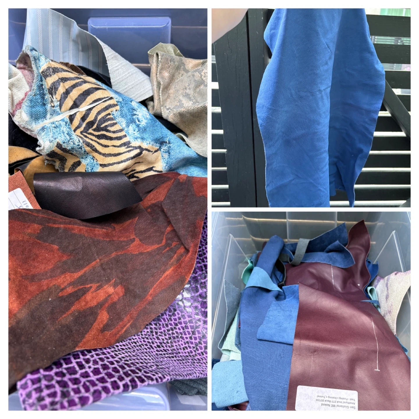 1x IKEA SAMLA 17 Gallon Tote Various Shearling scraps - Mostly grey and browns 1x 32 Liter Tote with handles Various Leather scraps - Various Browns 4x IKEA SAMLA 12 Gallon Totes -Various Leather scraps - Black - Medium Browns - Dark Browns - Dark Brown very small scraps 5x IKEA SAMLA 6 Gallon Totes Various Leather scraps - Purple/Blue - Green/Yellow - White/Cream/Bone - Random patterns - Red/Pink Large extremely light pink (could almost be mistaken for bone) leather piece approx. 46” x 24” at longest and widest parts Large thick pink leather piece approx 36” x 37” at longest and widest parts Large roll of thick blue leather approx 79” x 32” at longest and widest parts NOTE: leather scraps in photos are generally smaller than an 8.5” x 11” sheet of paper except for the random piece here and there that is larger. Various thicknesses but generally thin. Some have markings and/or sticker (can see in photos). SOLD AS A LOT INCLUDING BUCKETS More photos available upon request as Karrot restricts the number of photos you can post.