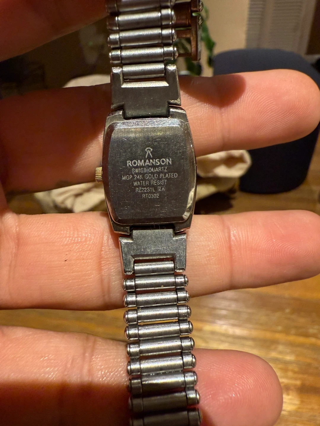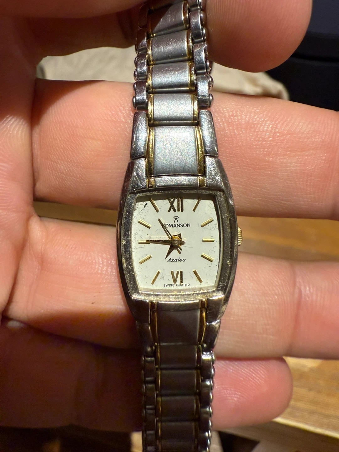 Selling a Romanson Azalea women's watch. It has a silver and gold-tone band and a white face. The watch is Swiss quartz and water-resistant. The model number on the back is RZ2231L RA RT0302.