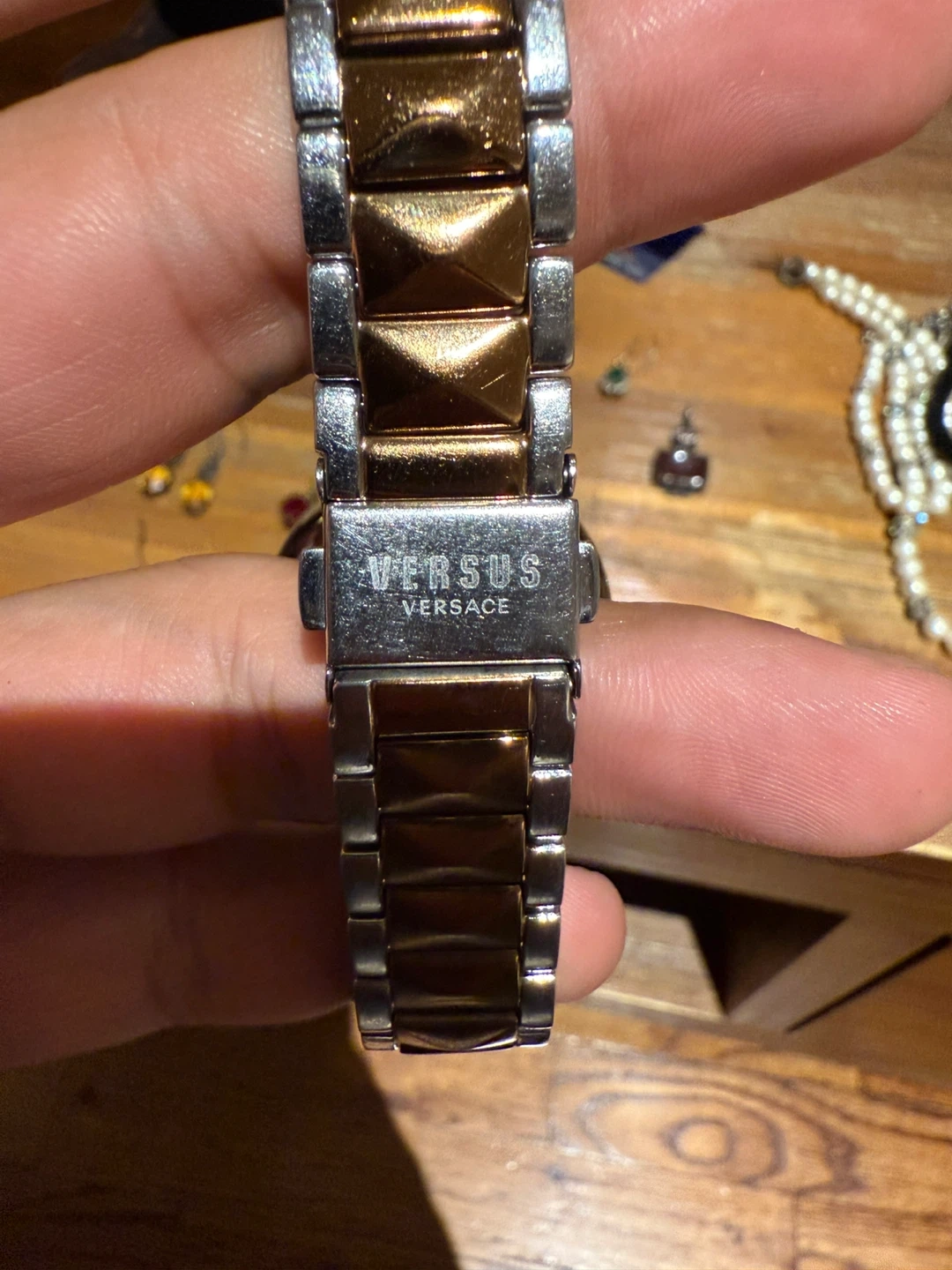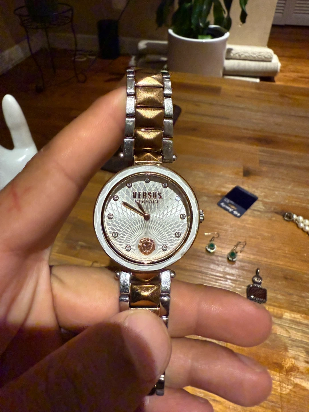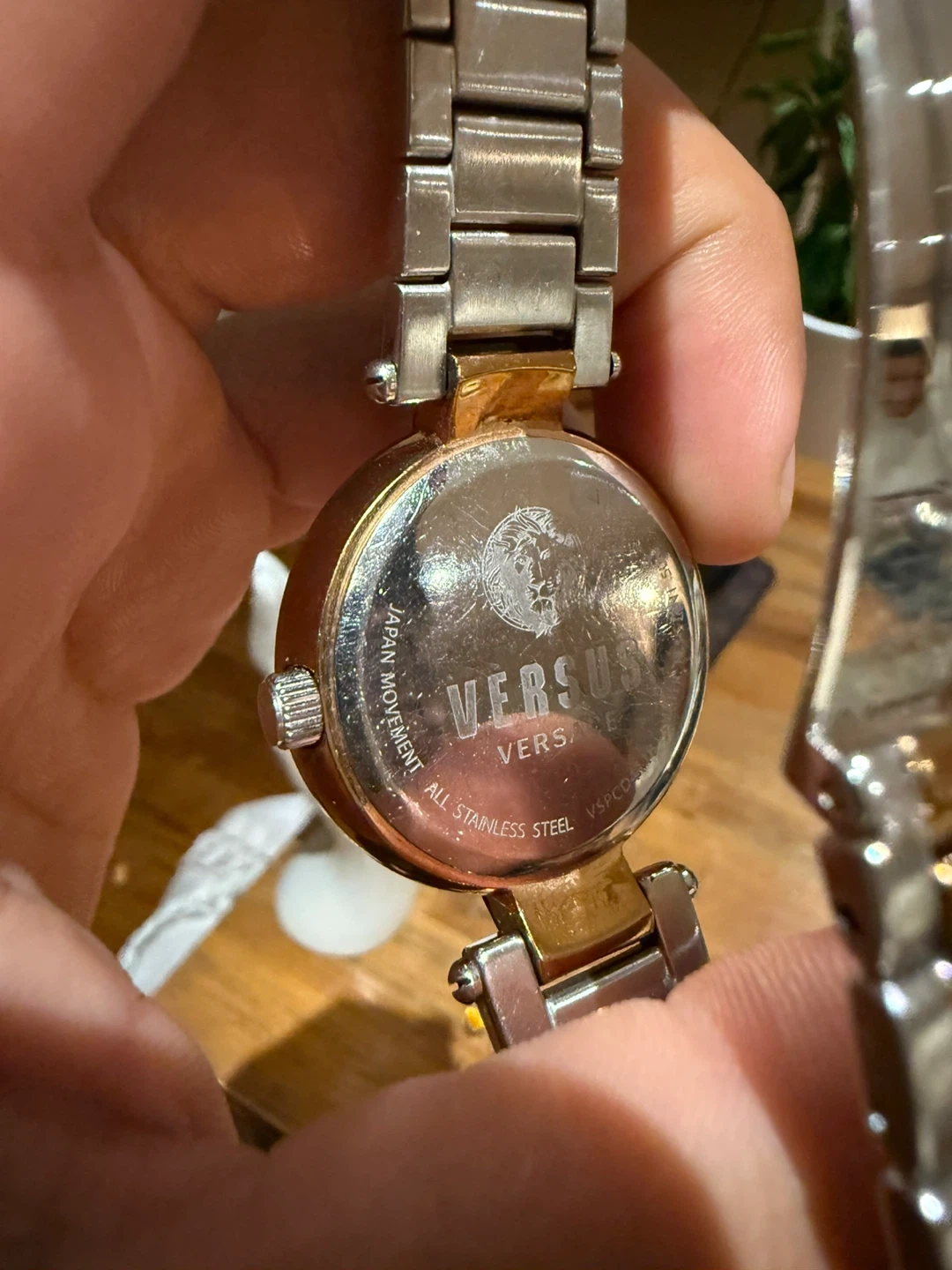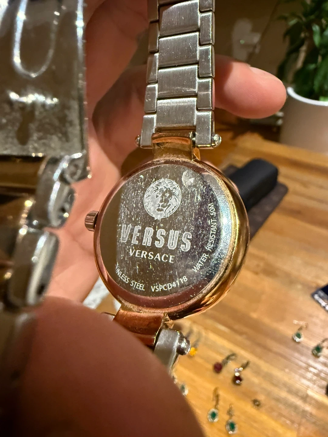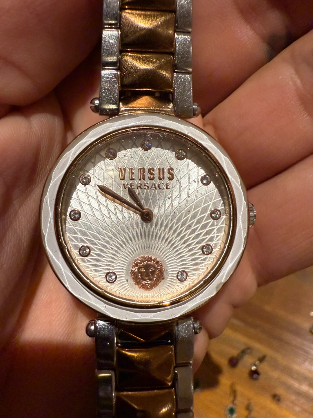 Selling a Versus Versace women's watch. It features a two-tone silver and gold band and a decorative face with the Versus Versace logo. The back of the watch is stainless steel and water-resistant to 50m