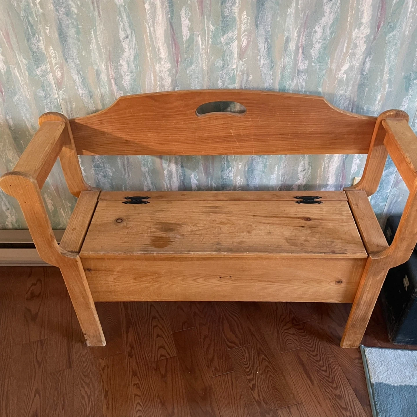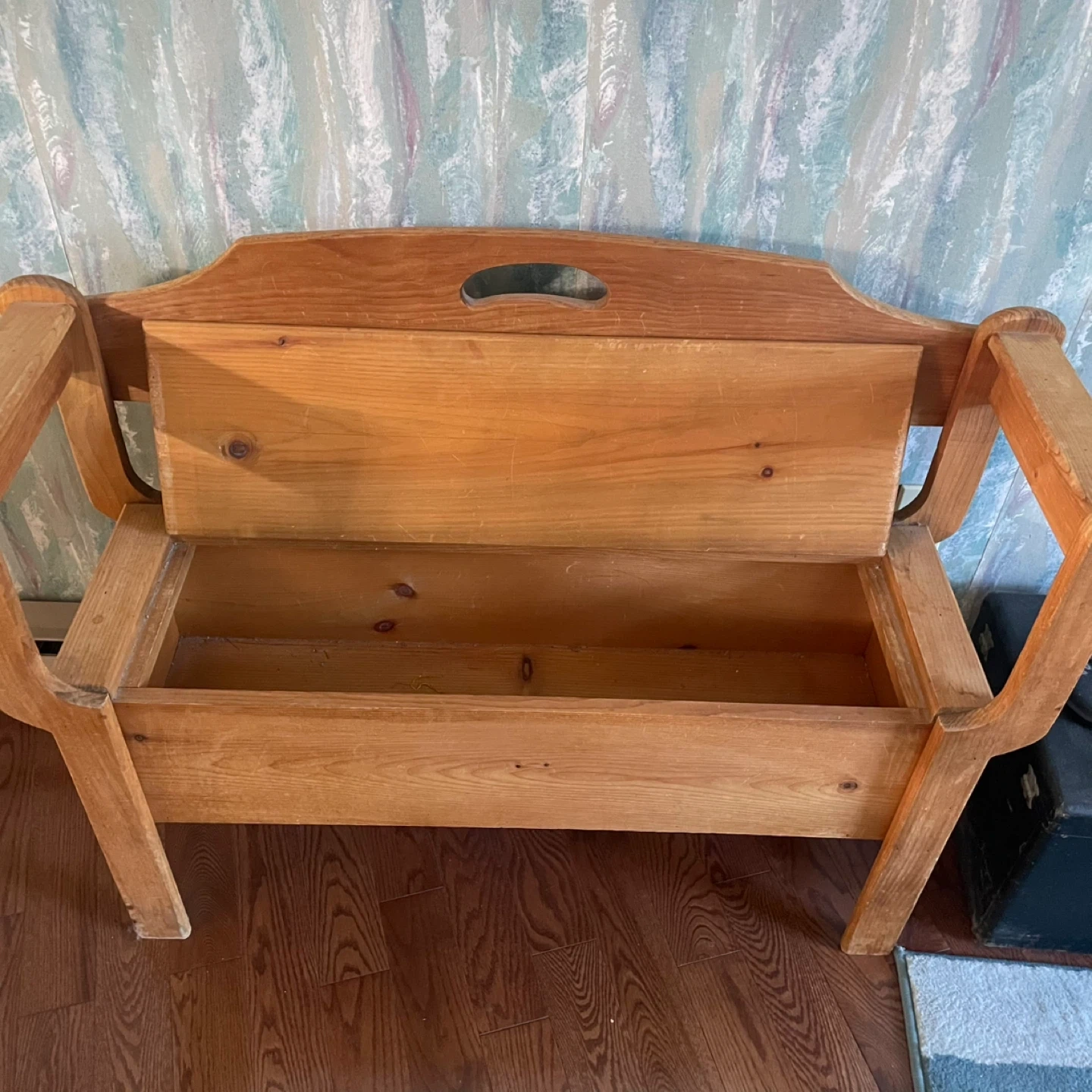 Selling a charming wooden bench with built-in storage! It's in good condition and would be a lovely addition to any entryway or living space. Perfect for storing extension cords, hats and gloves and other small household items. A unique and functional piece!