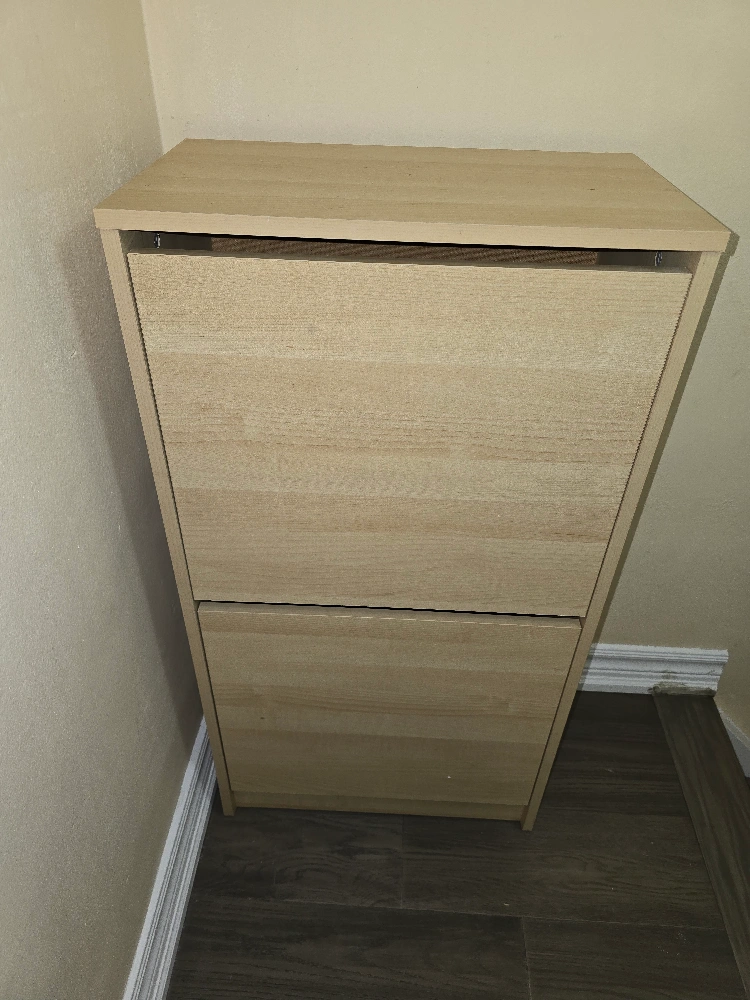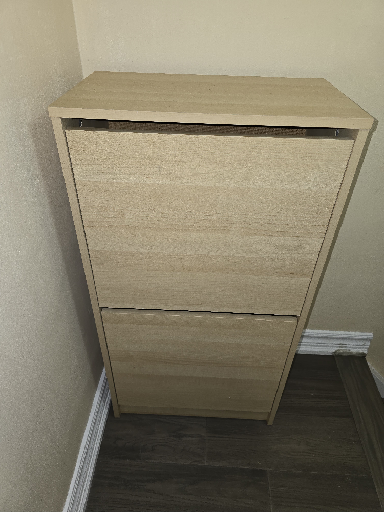 Selling a used IKEA Hemnes shoe cabinet in good condition. It's a great space-saver and perfect for keeping your entryway tidy. It has two compartments for shoes and a top surface for storing keys or mail. It's in a light wood colour that will match any decor