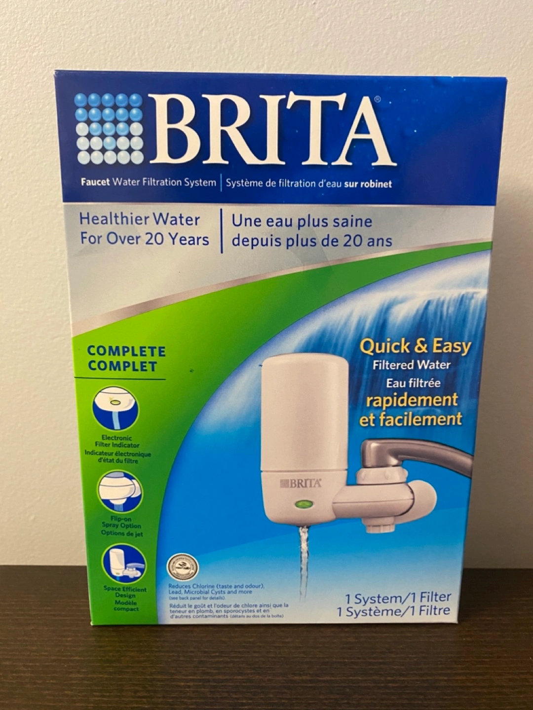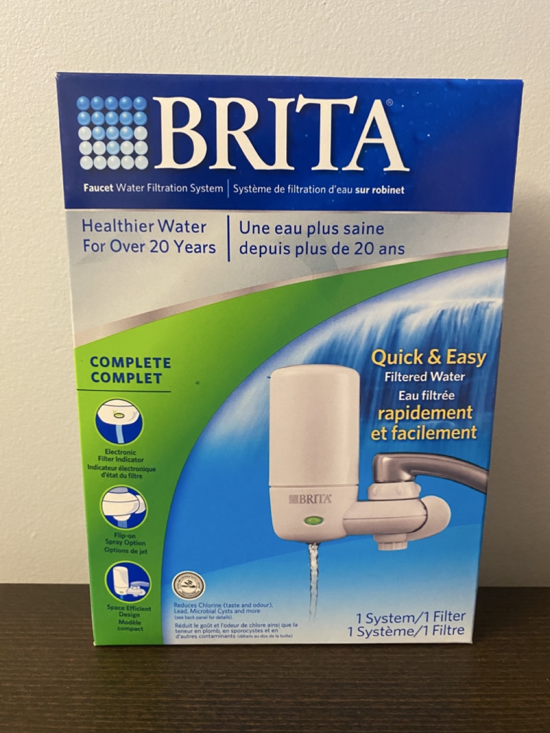 I'm selling a new Brita faucet water filtration system. It provides healthier water for over 20 years. It's a quick and easy way to filter your water right from the tap! It also reduces chlorine (taste and odour), lead, microbial cysts and more. It has an electronic filter indicator and a flip-on spray option