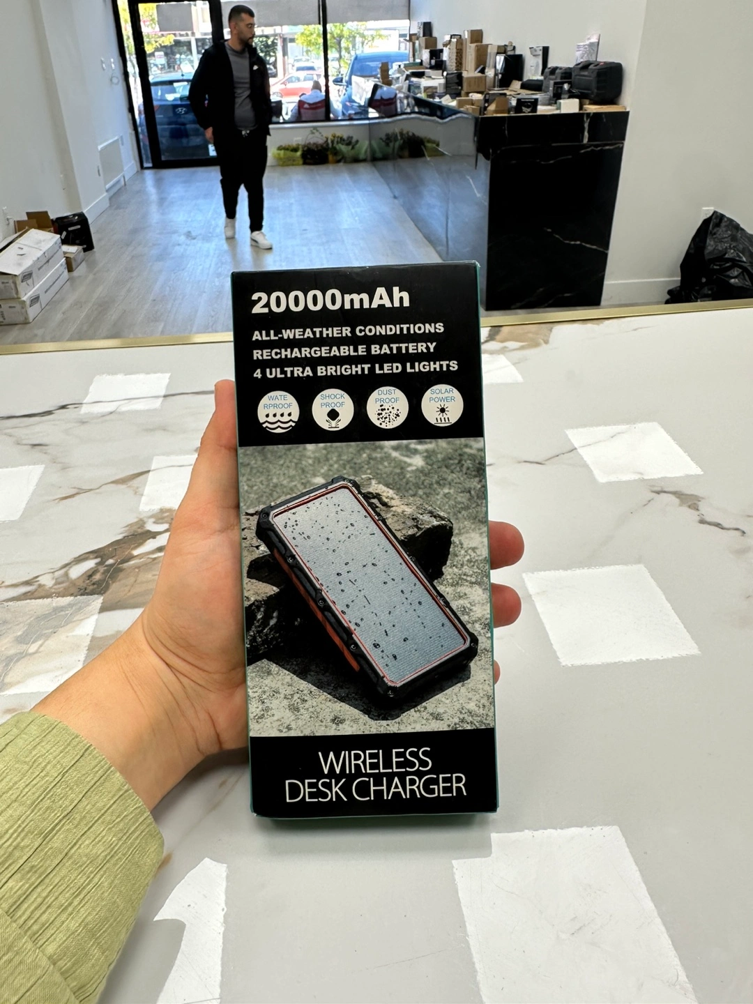 36Selling a wireless desk charger with a 20000mAh rechargeable battery. It's designed for all-weather conditions and includes 4 ultra-bright LED lights. It's water, shock, and dustproof, and even has solar power capabilities!