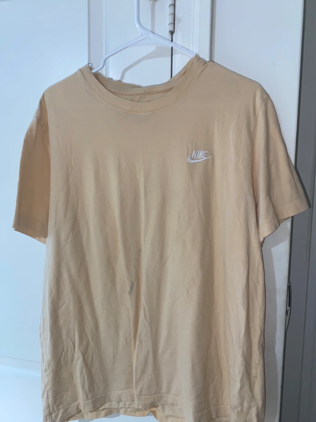 Selling a Nike t-shirt in a light yellow color. It has the Nike logo embroidered on the front. There are some signs of wear.