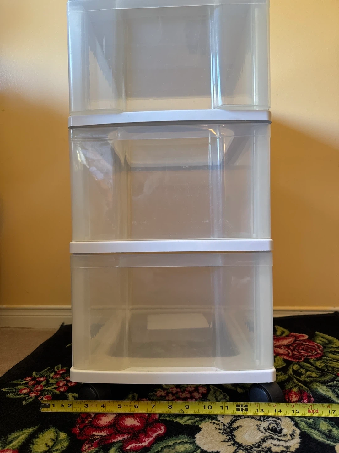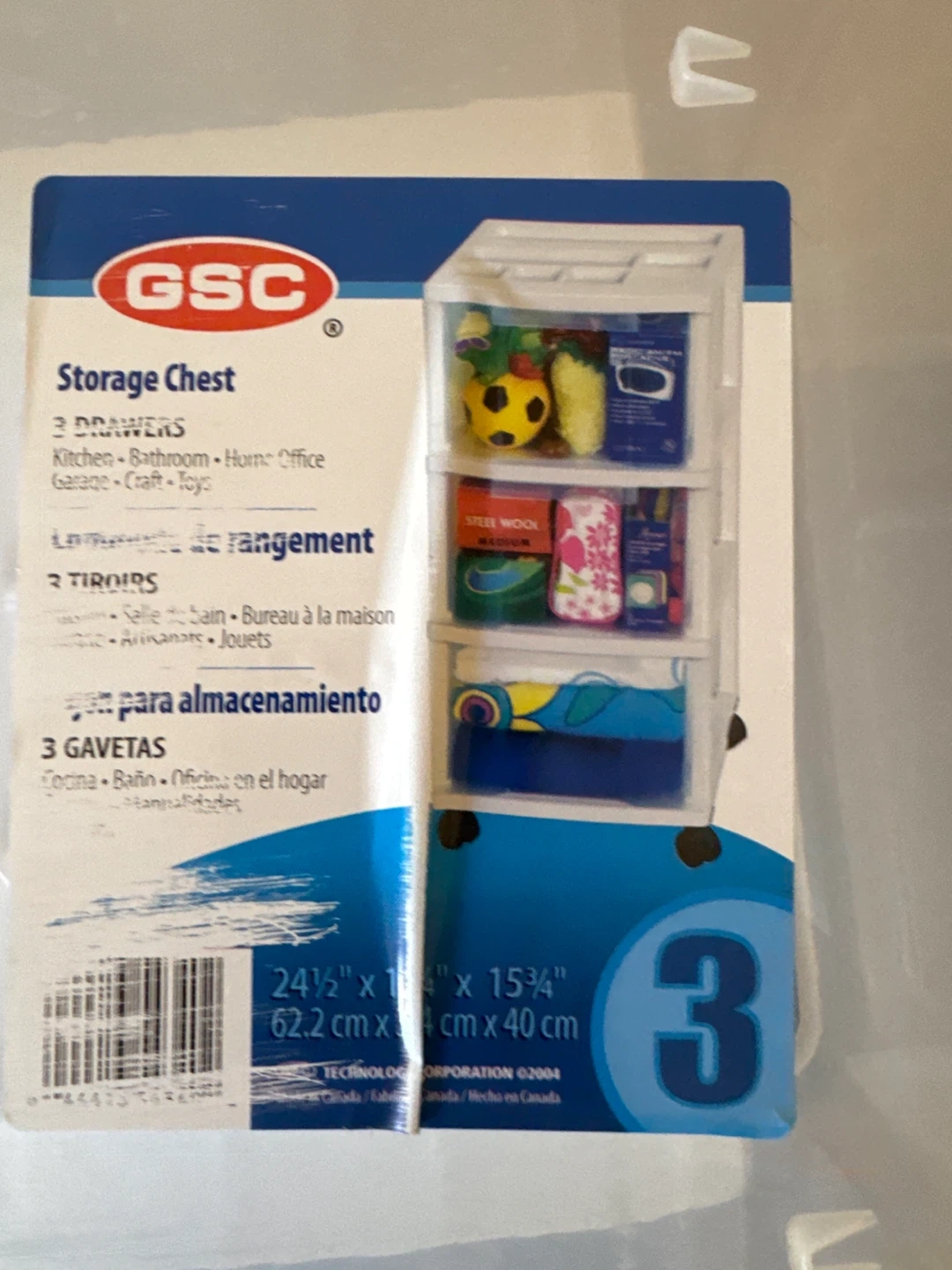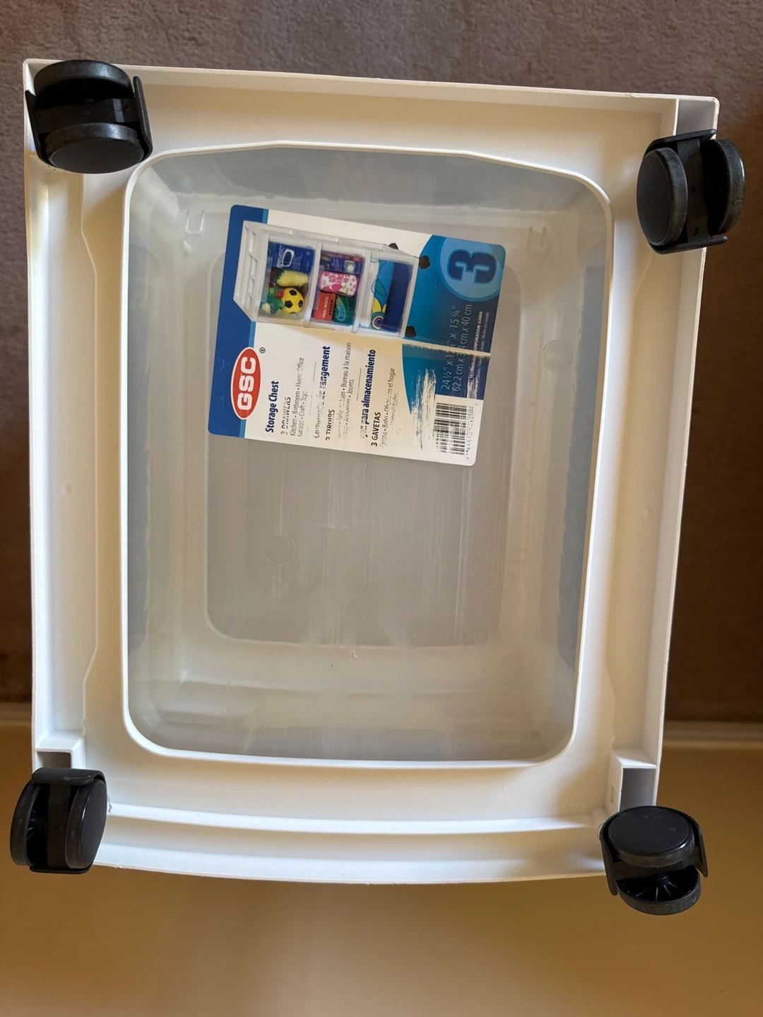 Selling a handy GSC storage chest with three drawers! It's on wheels, making it easy to move around. The dimensions are approximately 24.5" x 15.75" (62.2 cm x 40 cm). Great for organizing your kitchen, bathroom, home office, garage, or even toys