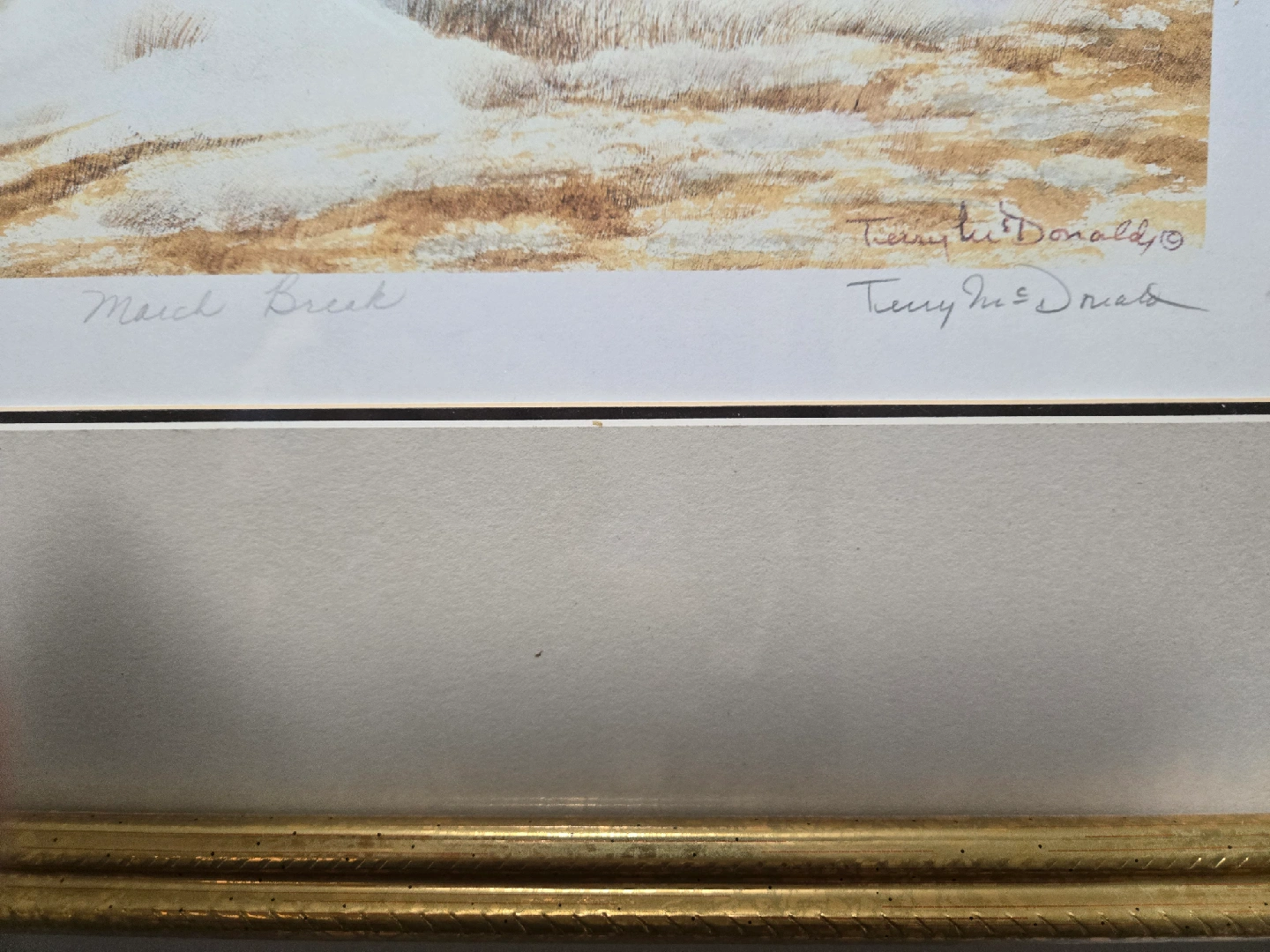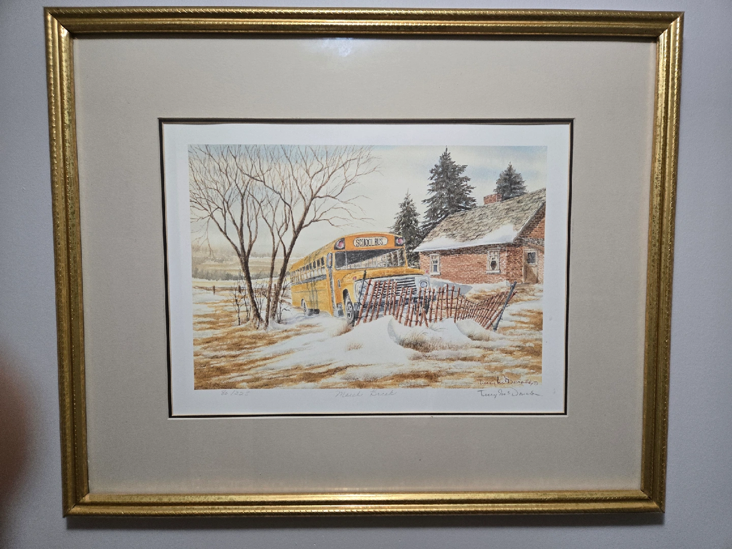Here's a framed print by artist Terry Mcdonald, titled 'March Break'! It's a lovely winter scene featuring a school bus and a cozy house. The print is numbered 80/225. Like New Condition, framed dimensions 21"×18". ASKING ONLY $20 FIRM.