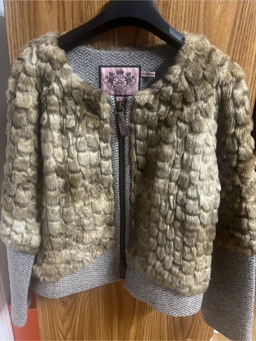 Cozy up in this stylish Juicy Couture jacket! It features a faux fur body with herringbone pattern sleeves and trim. Size L.