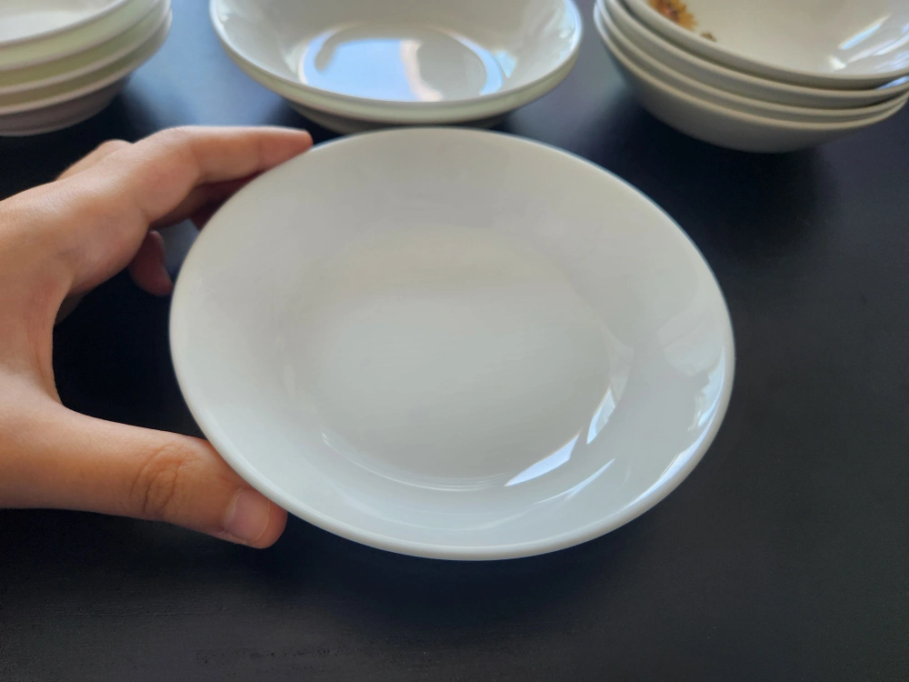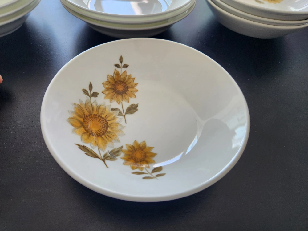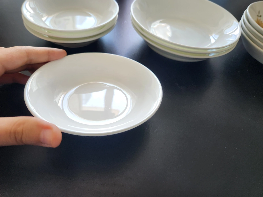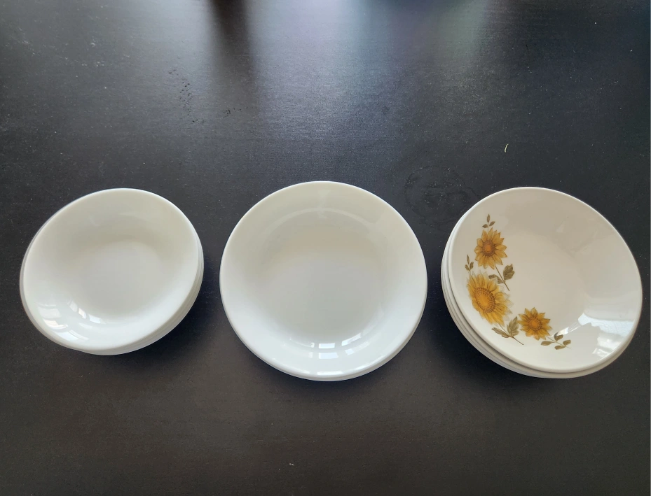 Selling a set of white ceramic bowls! They're in great shape and perfect for everyday use. One of the bowls has a sunflower pattern. They're good for soy sauce or any other type of sauce, or snacks, or soup. A reminder that the white largest one is smaller than medium sized bowl. Total 11 Bowls: white small 4, white large 3, sunflower 4. Size comparison: White (smallest) < Sunflower (2nd small) < White (lest small)