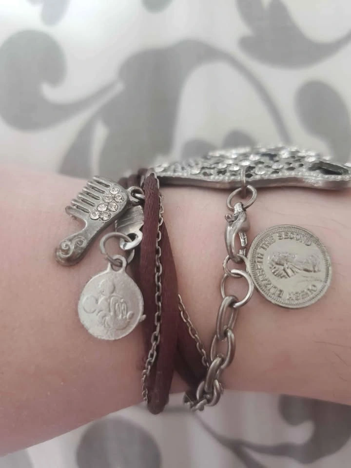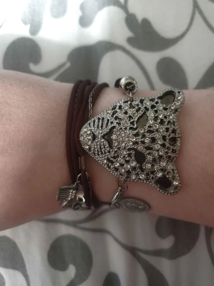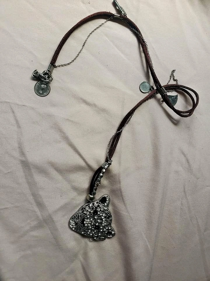 Sparkly bracelet that can be worn as a necklace with large cheeta pendant and other smaller pendants. Let me know if you're interested!