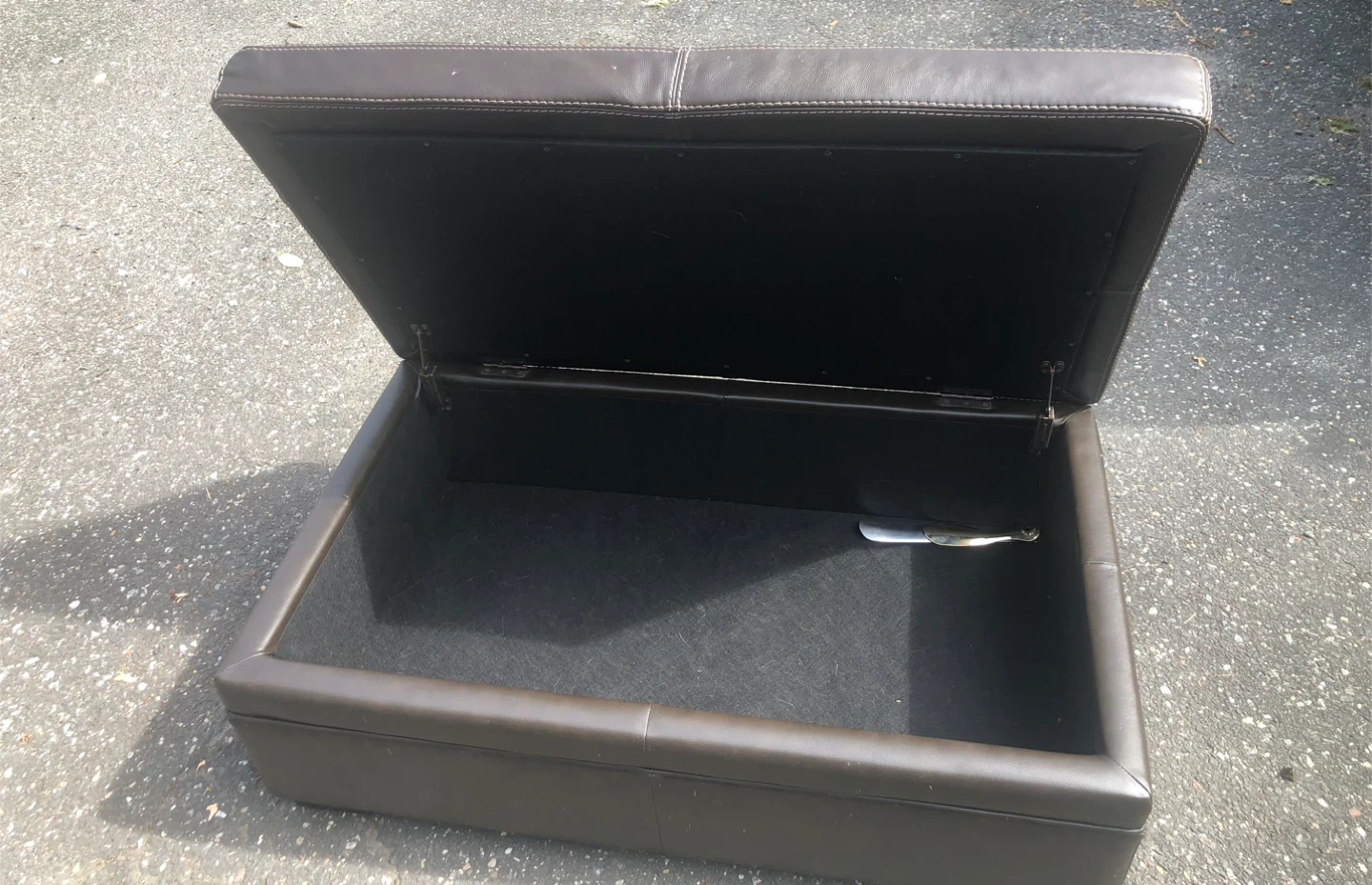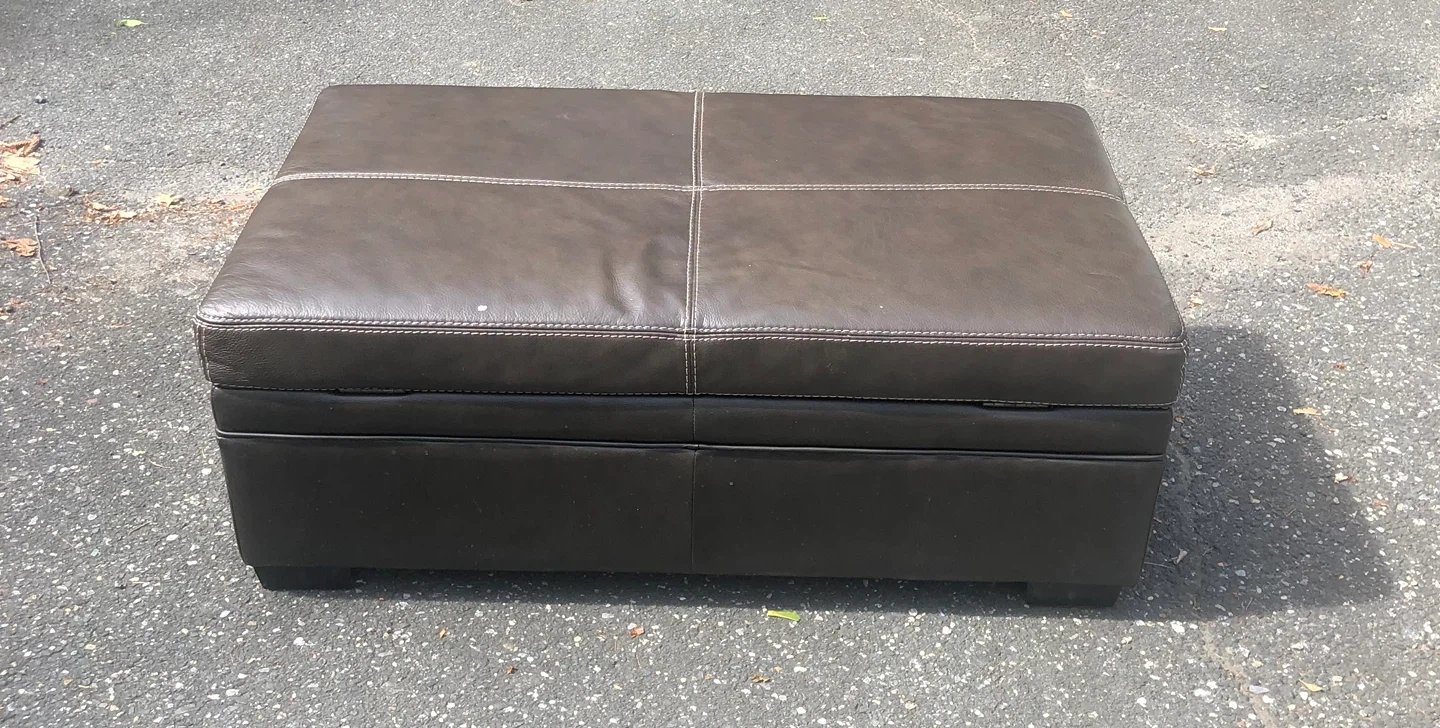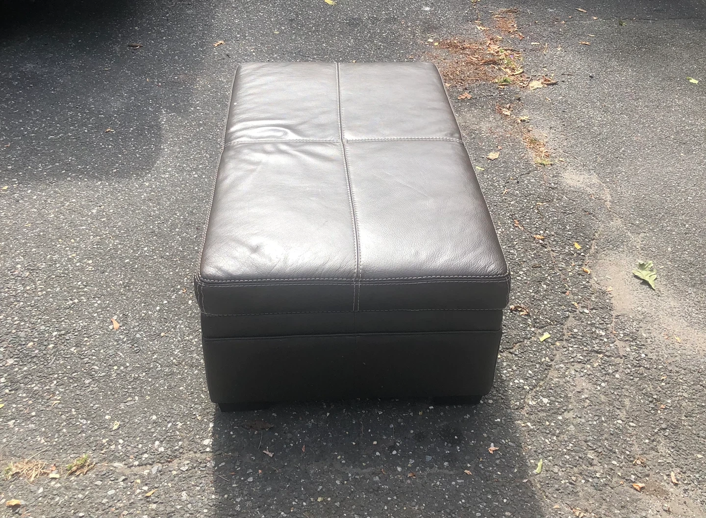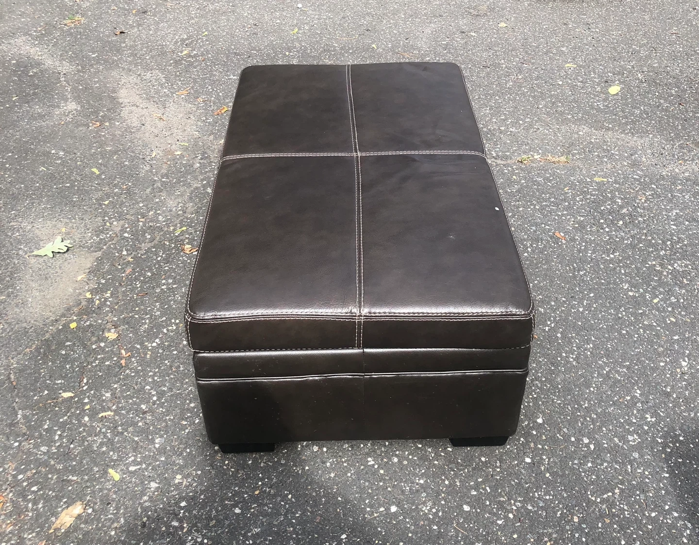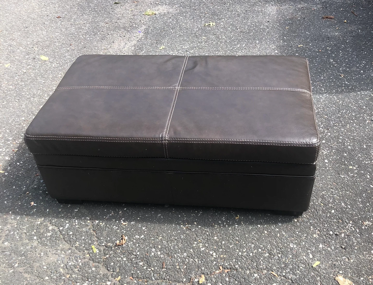 I'm selling a brown storage ottoman. It's in good condition and provides ample storage space. The top lifts up to reveal a spacious interior, perfect for storing blankets, pillows, or other household items.