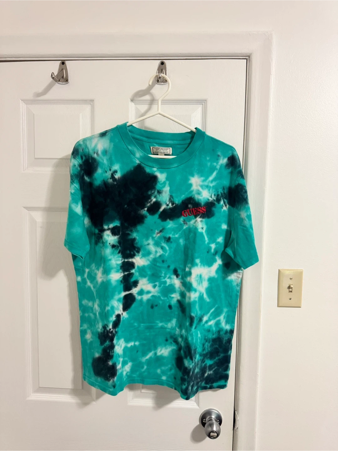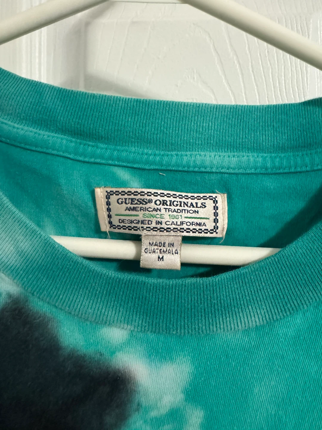 Looking to sell this Guess Originals tie-dye t-shirt! It's a size medium and features a cool green and black tie-dye pattern. The shirt has the Guess logo on the front and a fun design on the back. Perfect for adding a pop of colour to your wardrobe!