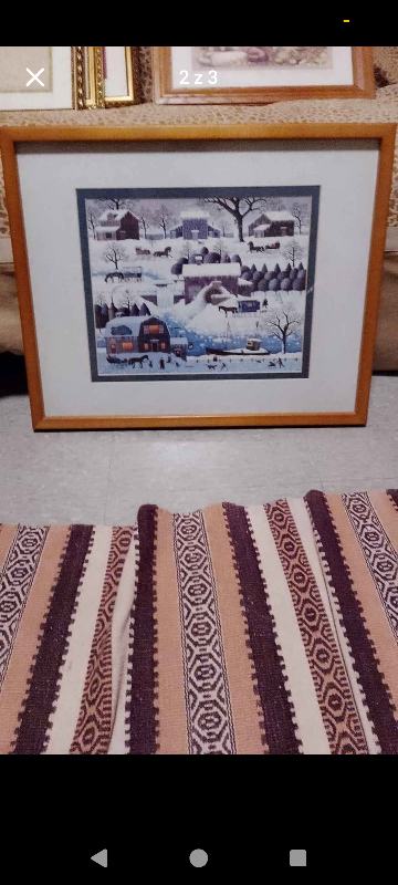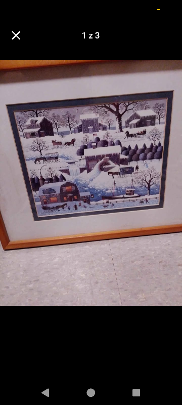 This is a framed print by Charles Wysocki. It depicts a winter scene with houses, horses, and people in the snow. It is framed in a light brown wooden frame.
