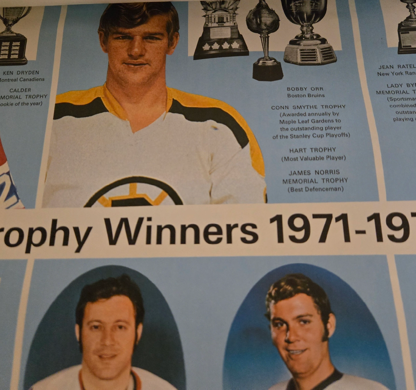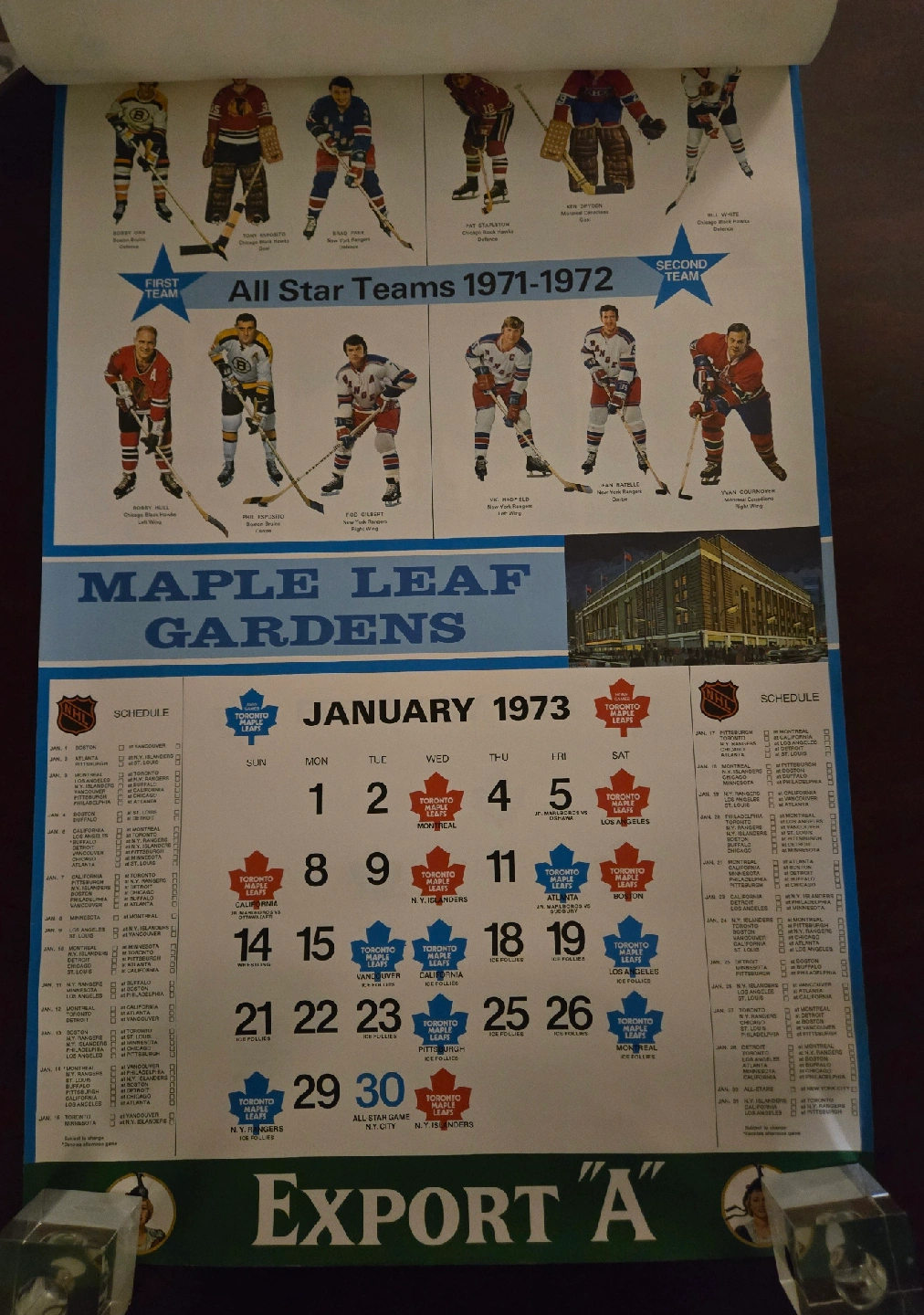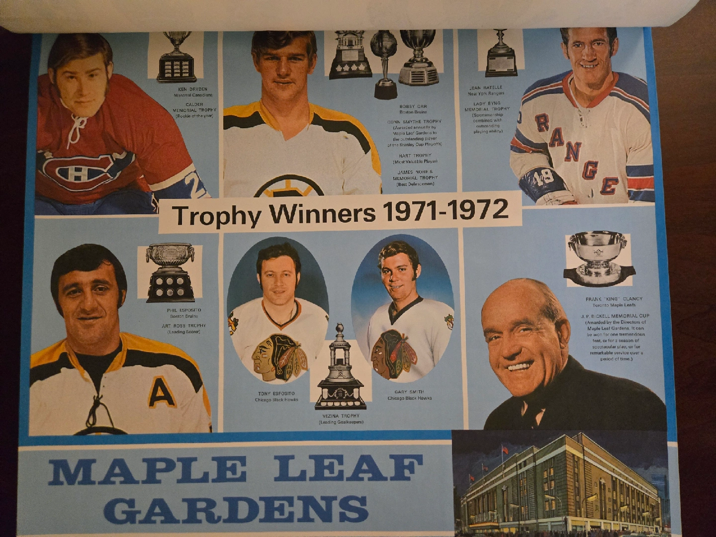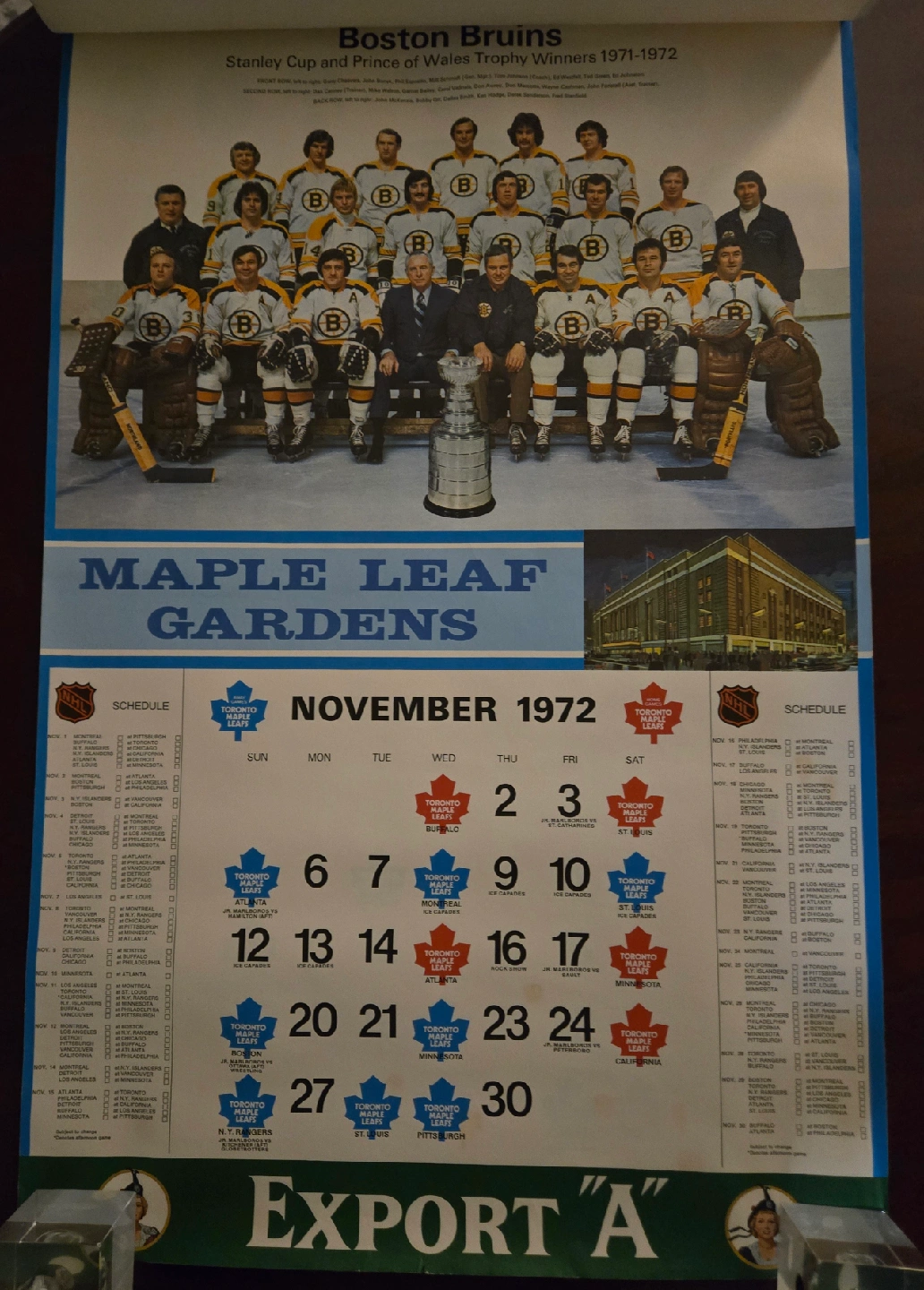 1. 1971/72 Calender dimensions 16.5"×26". Leafsteam photo, Bruins Team photo, Hawks Team Photo and Trophy Winners Bobby Orr and Ken Dryden. The Calender is in Very Good Condition, considering it's age.