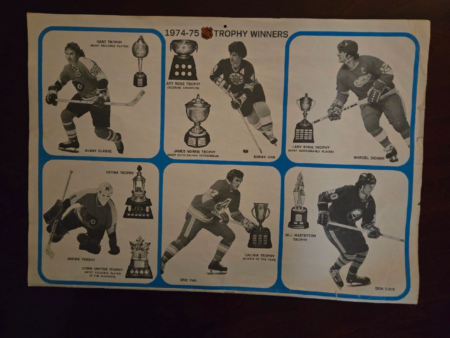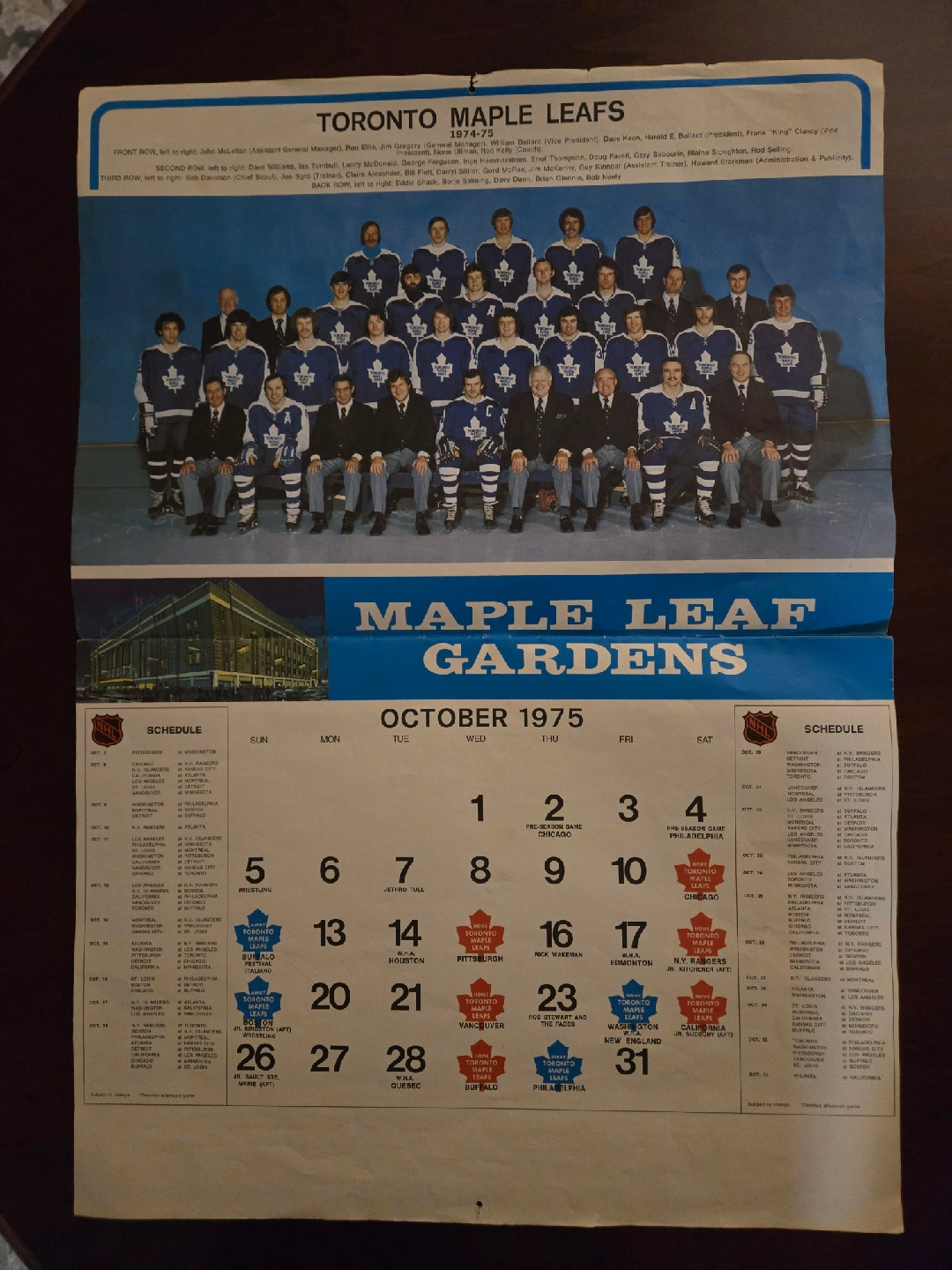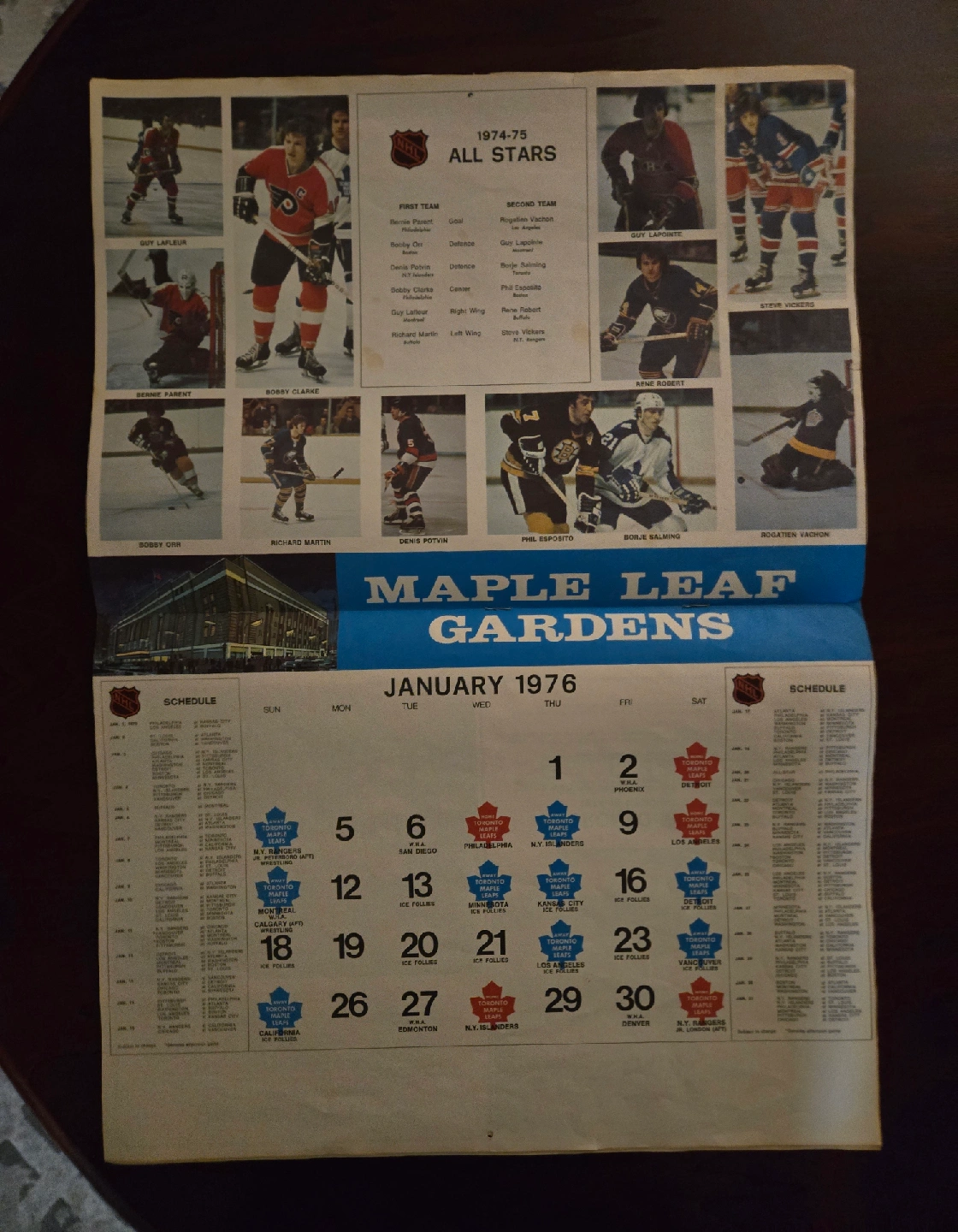 2. 1975/76 Calender dimensions 22.5"×16". Includes Leafs Team Photo, Sabres Team Photo, Flyers Team Photo, Allstars and Trophy Winners Bobby Orr, Bobby Clarke and Marcel Dionne. Calendar is in very Good Condition considering it's age.