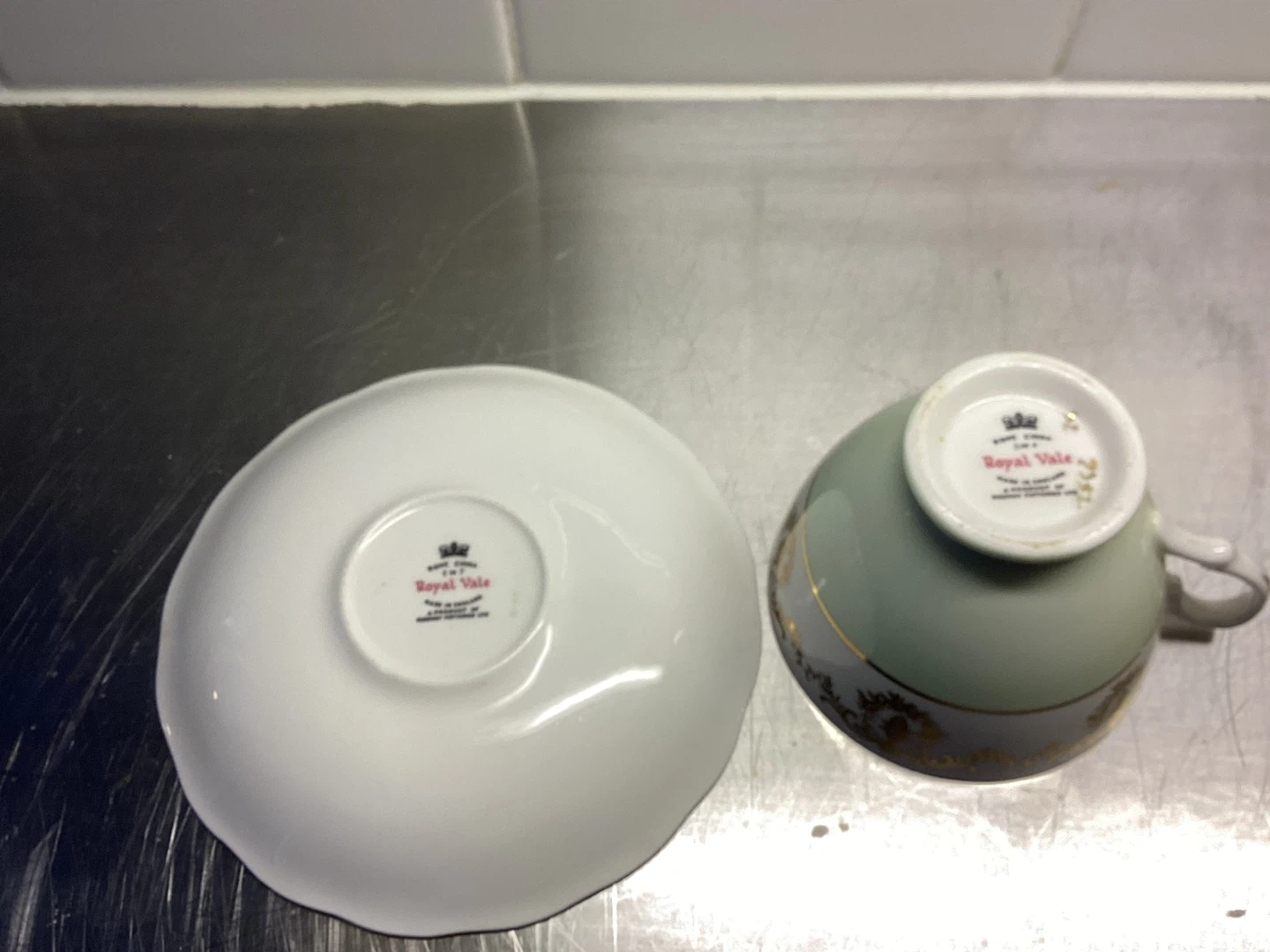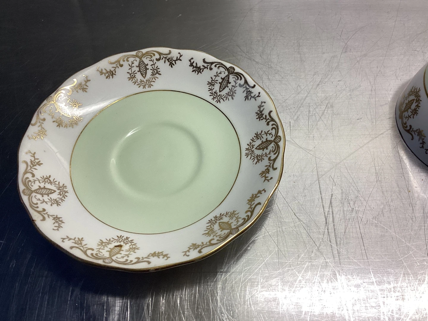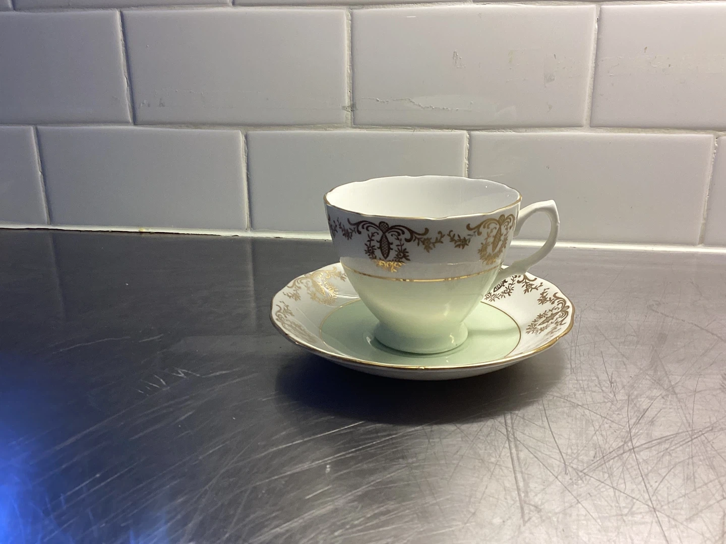 Beautiful gold and white and light green pattern cup and saucer made in England by Ridgesy Potteries