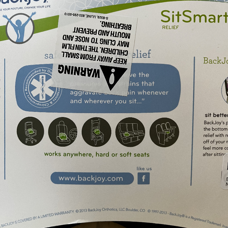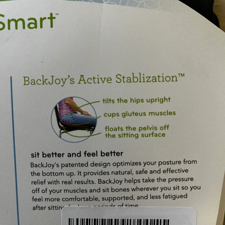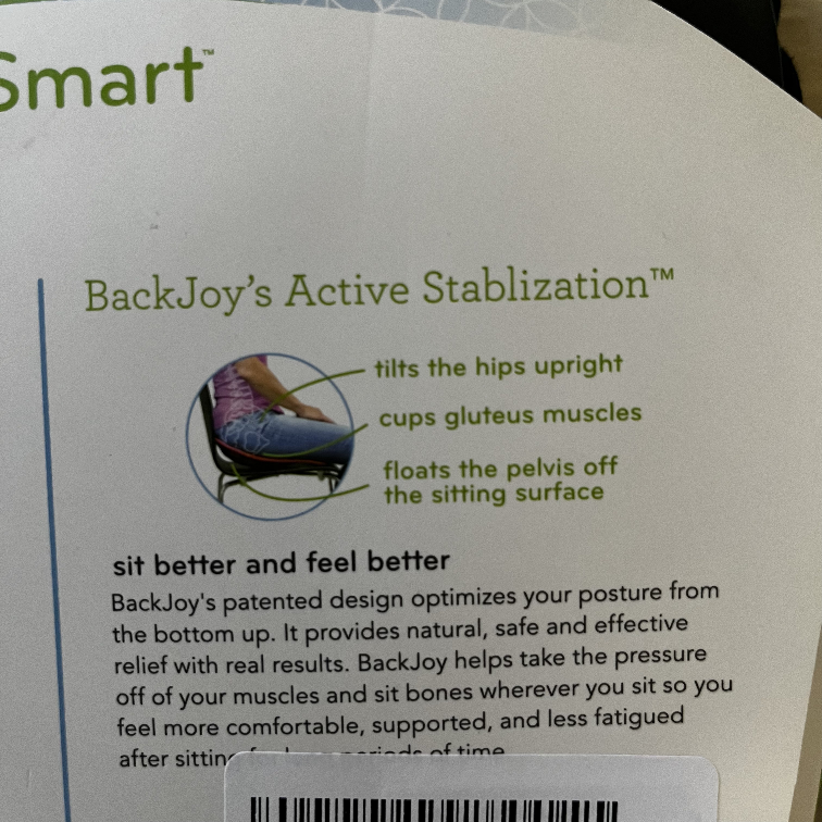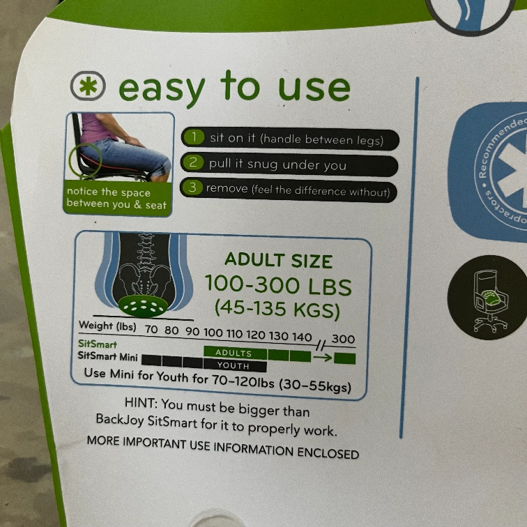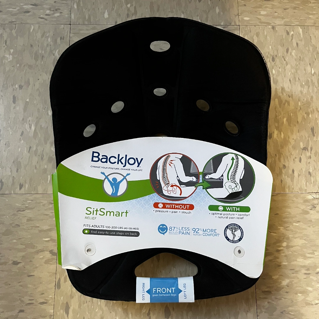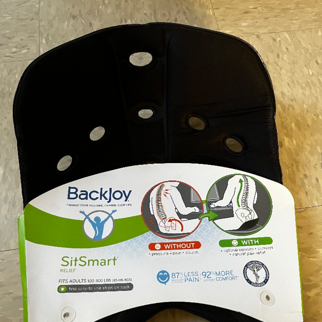 Get ready to sit better and feel better with this Backjoy SitSmart Relief! It's designed to optimize your posture and provide natural, safe, and effective relief. This adult-size seat fits individuals between 100-300 lbs (45-135 kgs). It tilts the hips upright, cups gluteus muscles, and floats the pelvis off the sitting surface, so you can sit comfortably for extended periods of time. Its lightly used for my last week in the office and comes in the original packaging. For pick up only