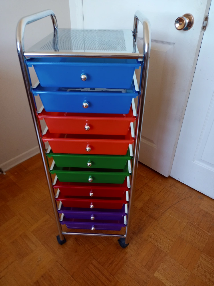 100This rolling storage cart is perfect for organizing any space! It features multiple colourful drawers, making it easy to sort and store items. The cart is on wheels, so it's easy to move around. Great for a craft room, kids room, or office!