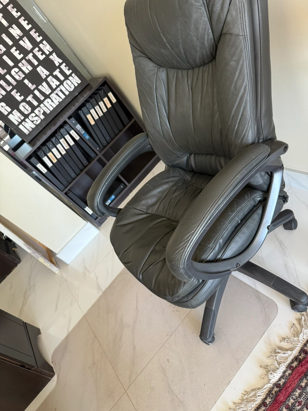 Selling a comfortable black leather office chair. It's in good condition and perfect for a home office or workspace. The chair features a high back for support and adjustable height.