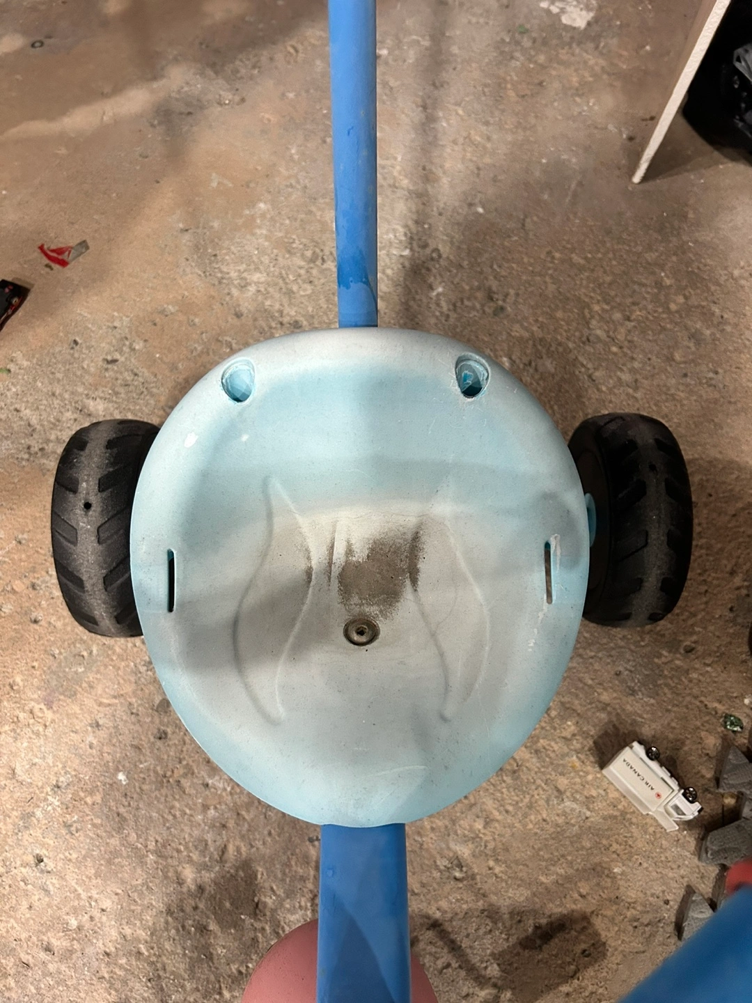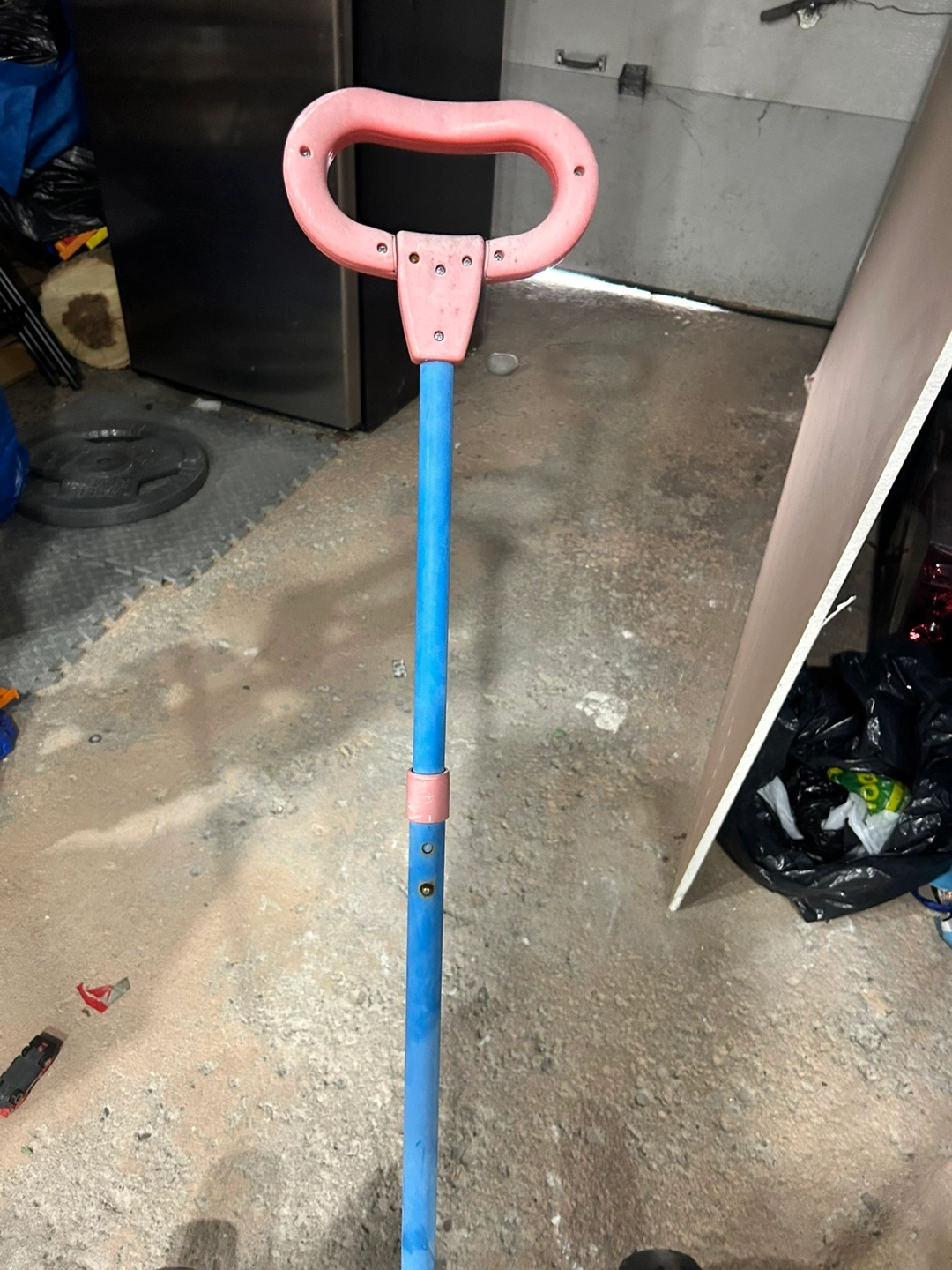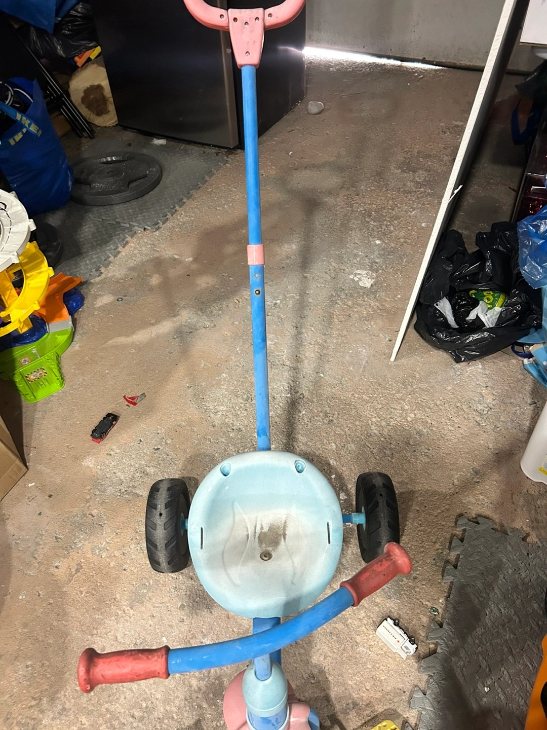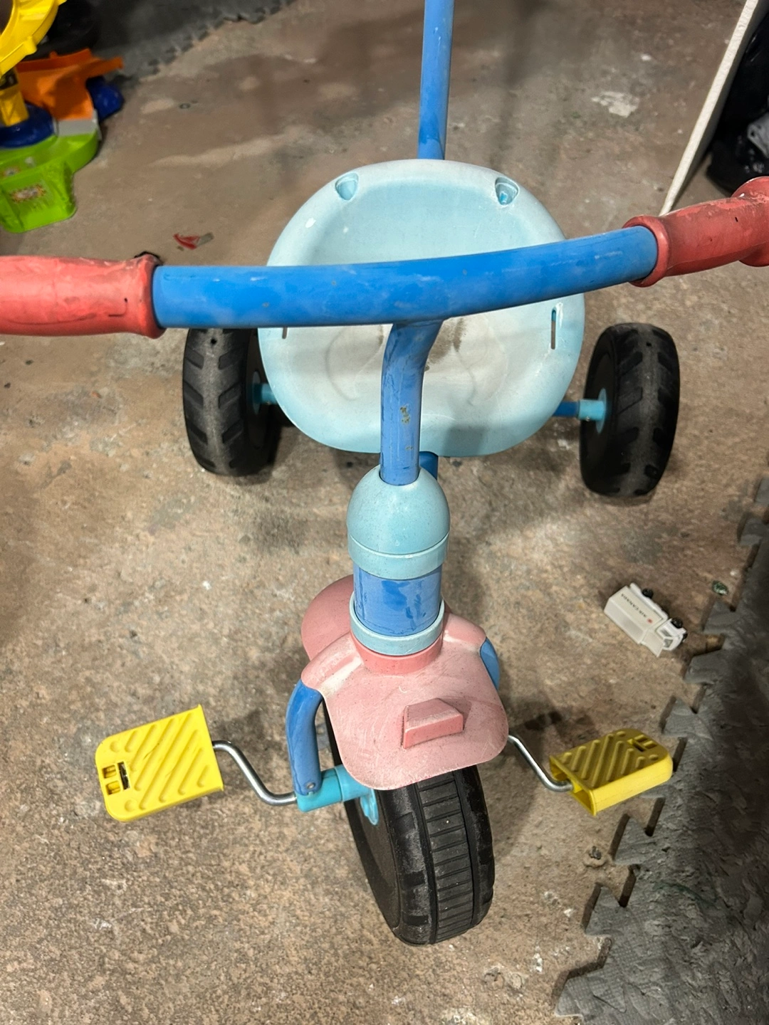34Selling a kids tricycle. Great for toddlers learning to ride. It features a push bar for parents to help guide little ones. The colours are blue, pink, and yellow.