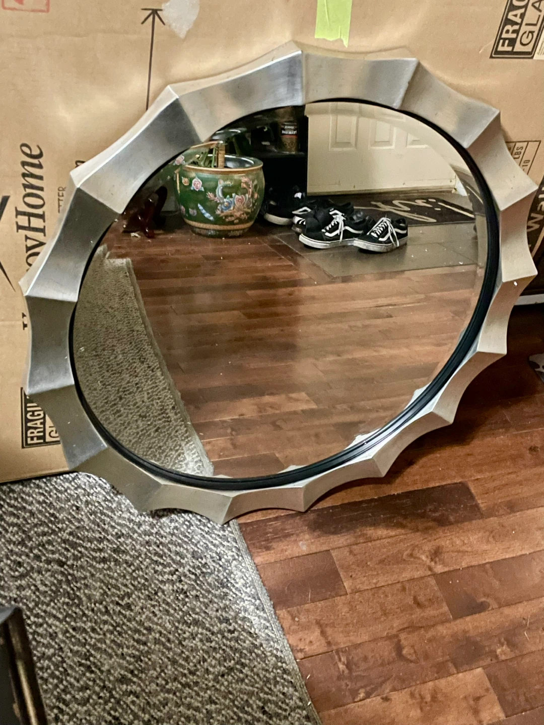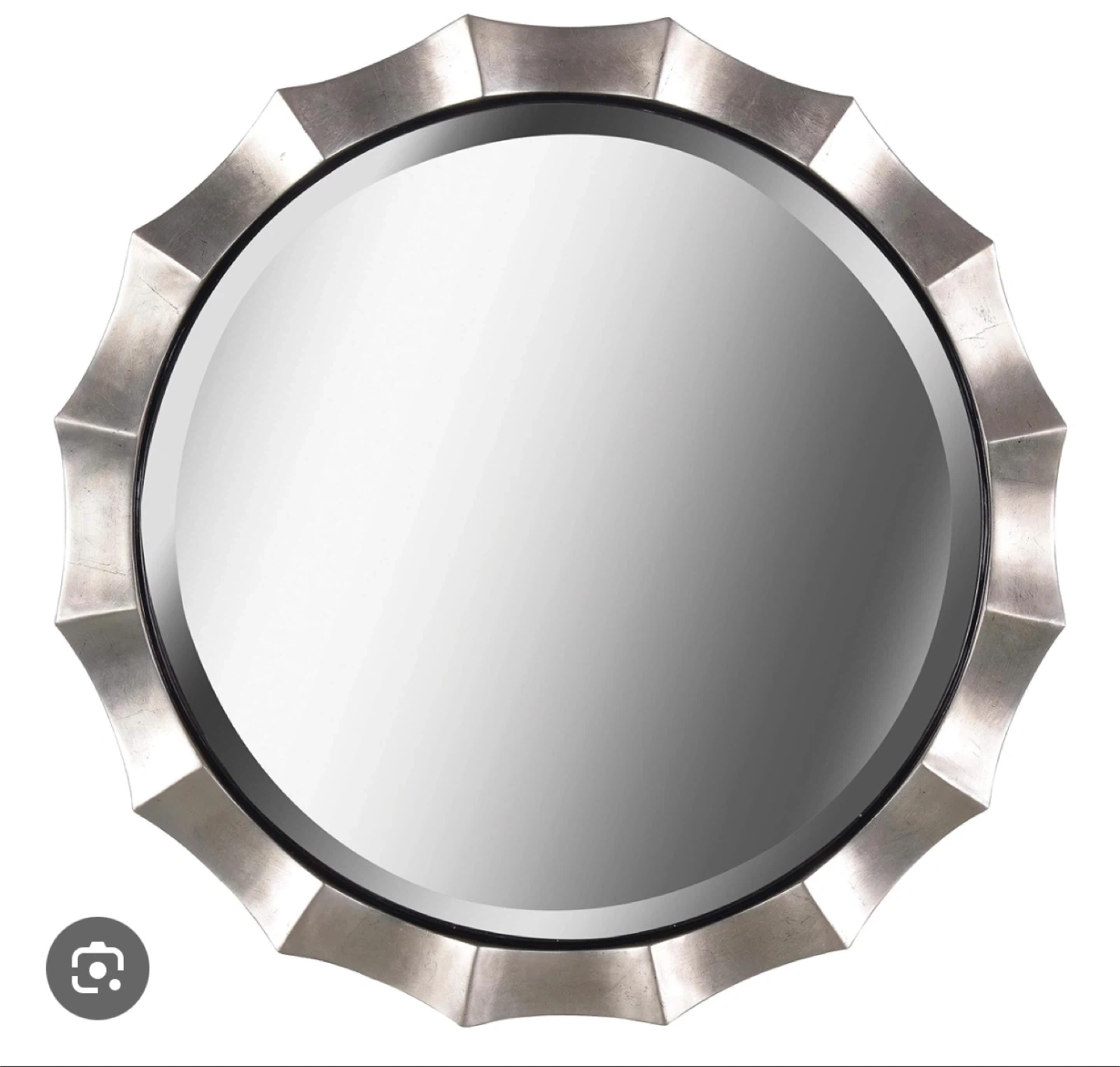 Selling a lovely round wall mirror with a stylish silver frame. It's in great shape and would look fantastic in any room. The mirror has a unique design that adds a touch of elegance to your decor. Perfect for adding light and a decorative touch to your space