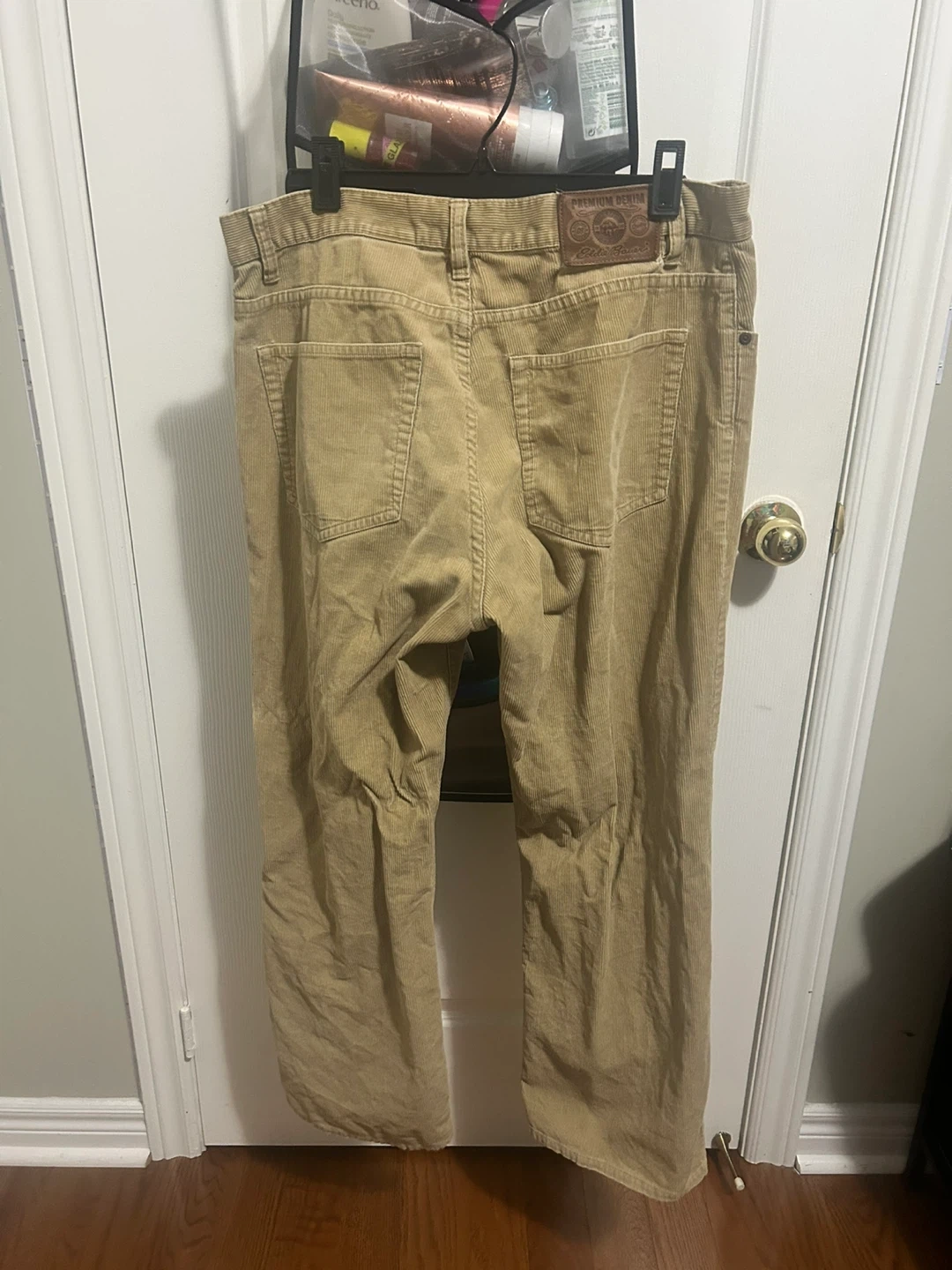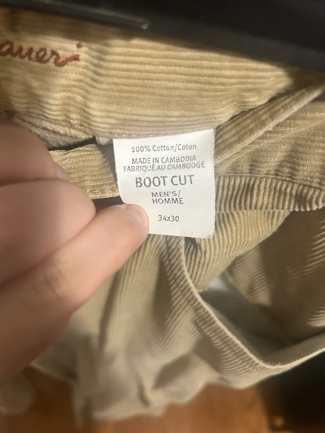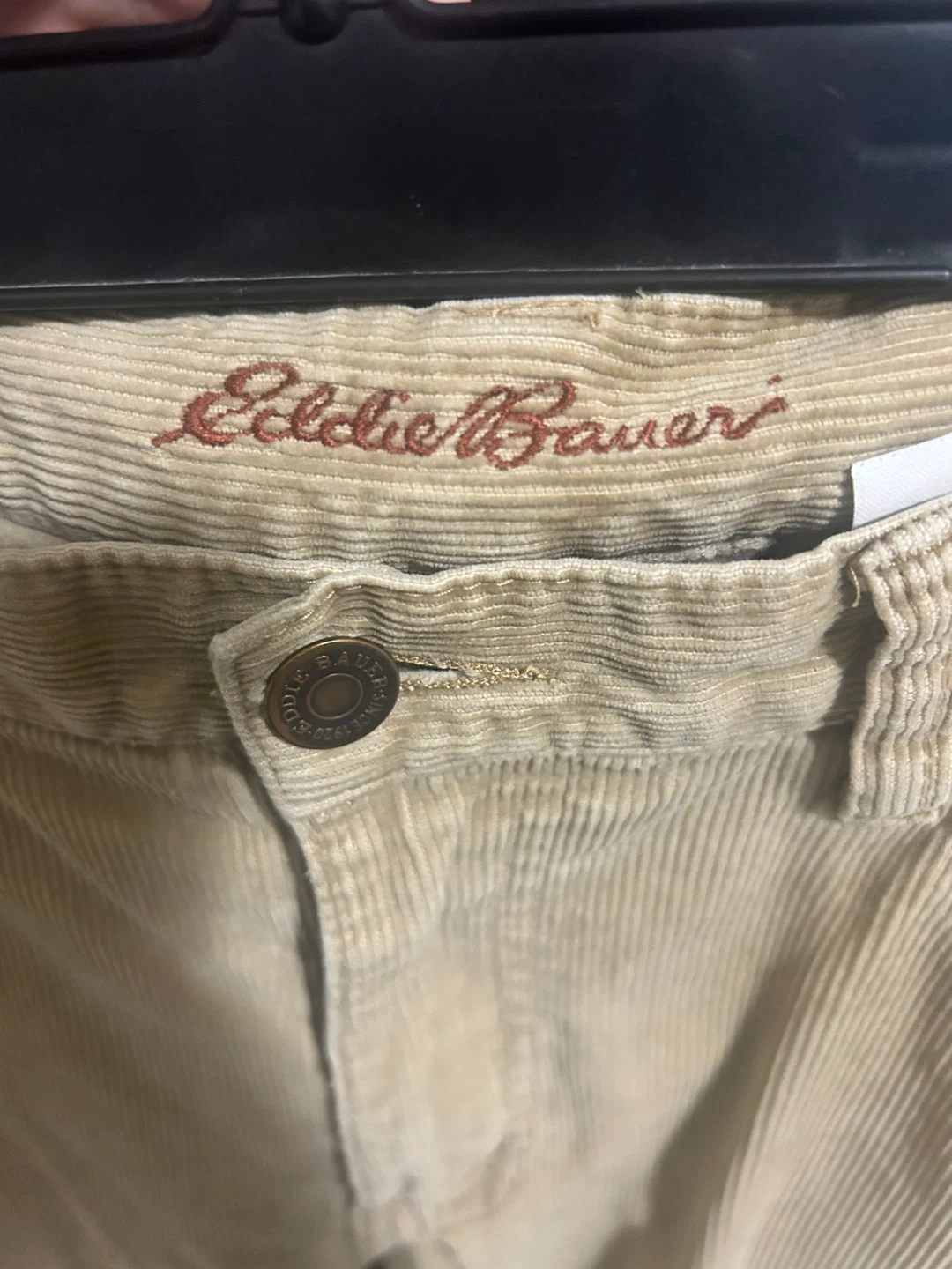 Selling a pair of Eddie Bauer corduroy pants. They are boot cut and size 34x30. The material is 100% cotton.