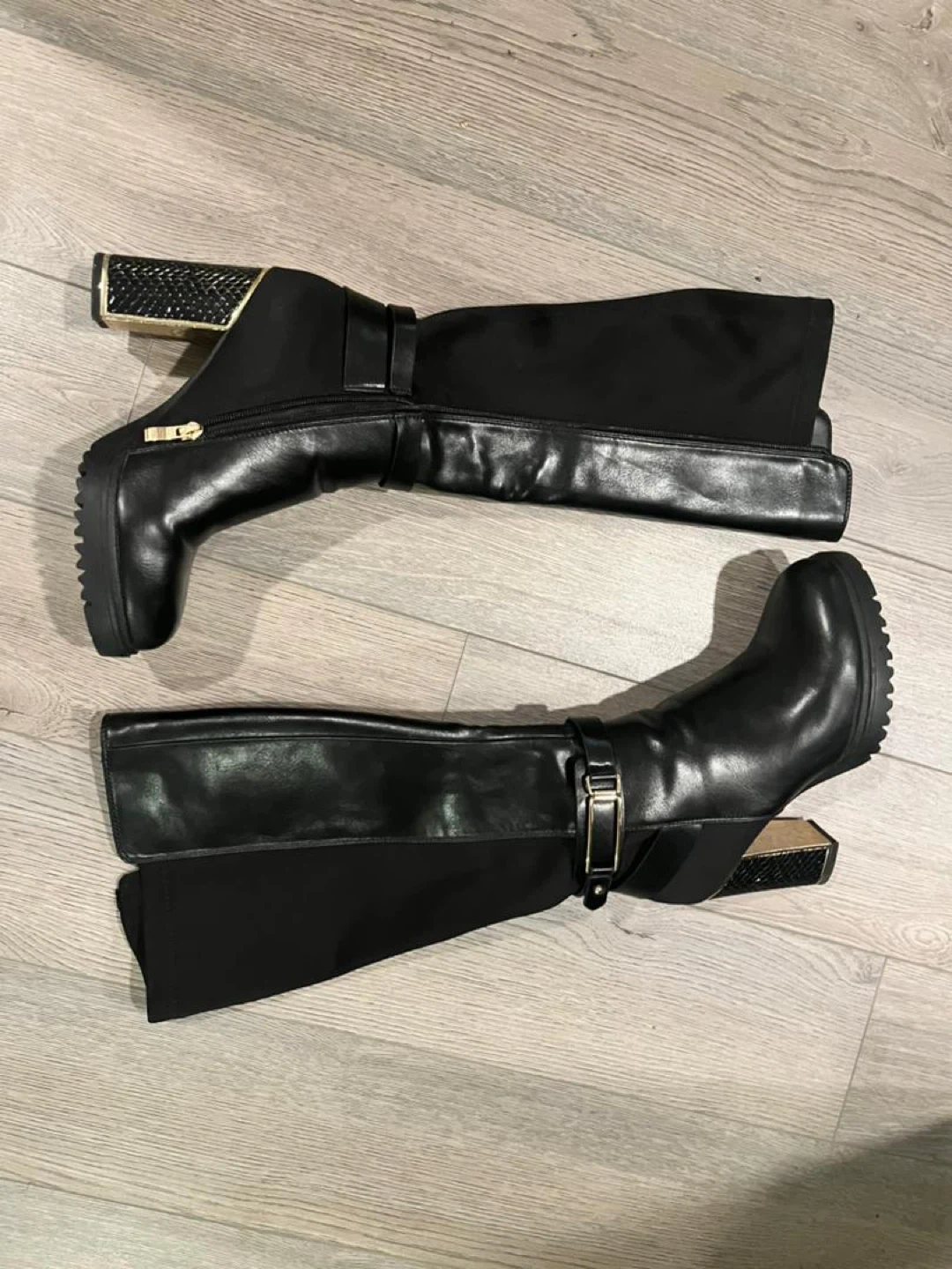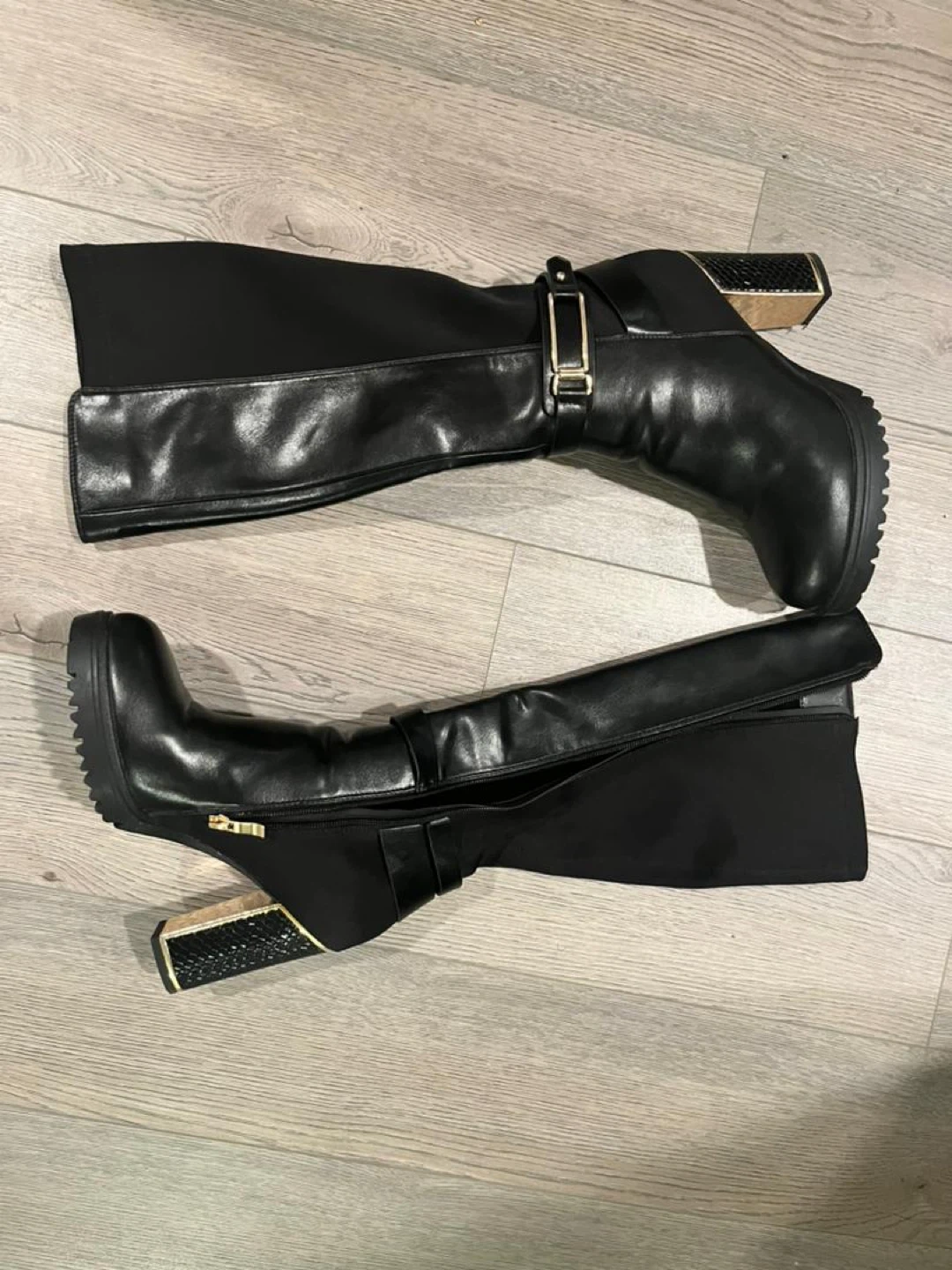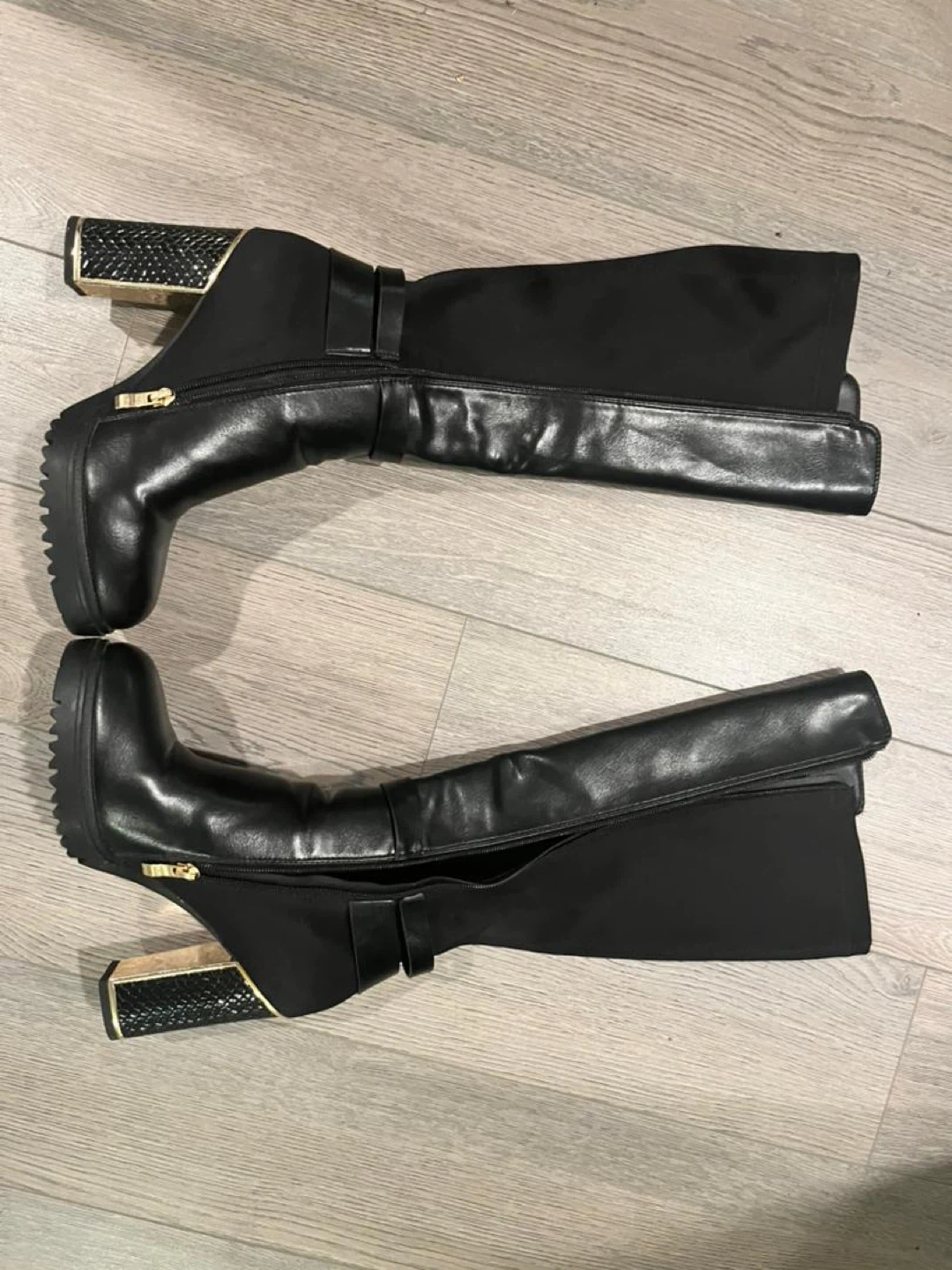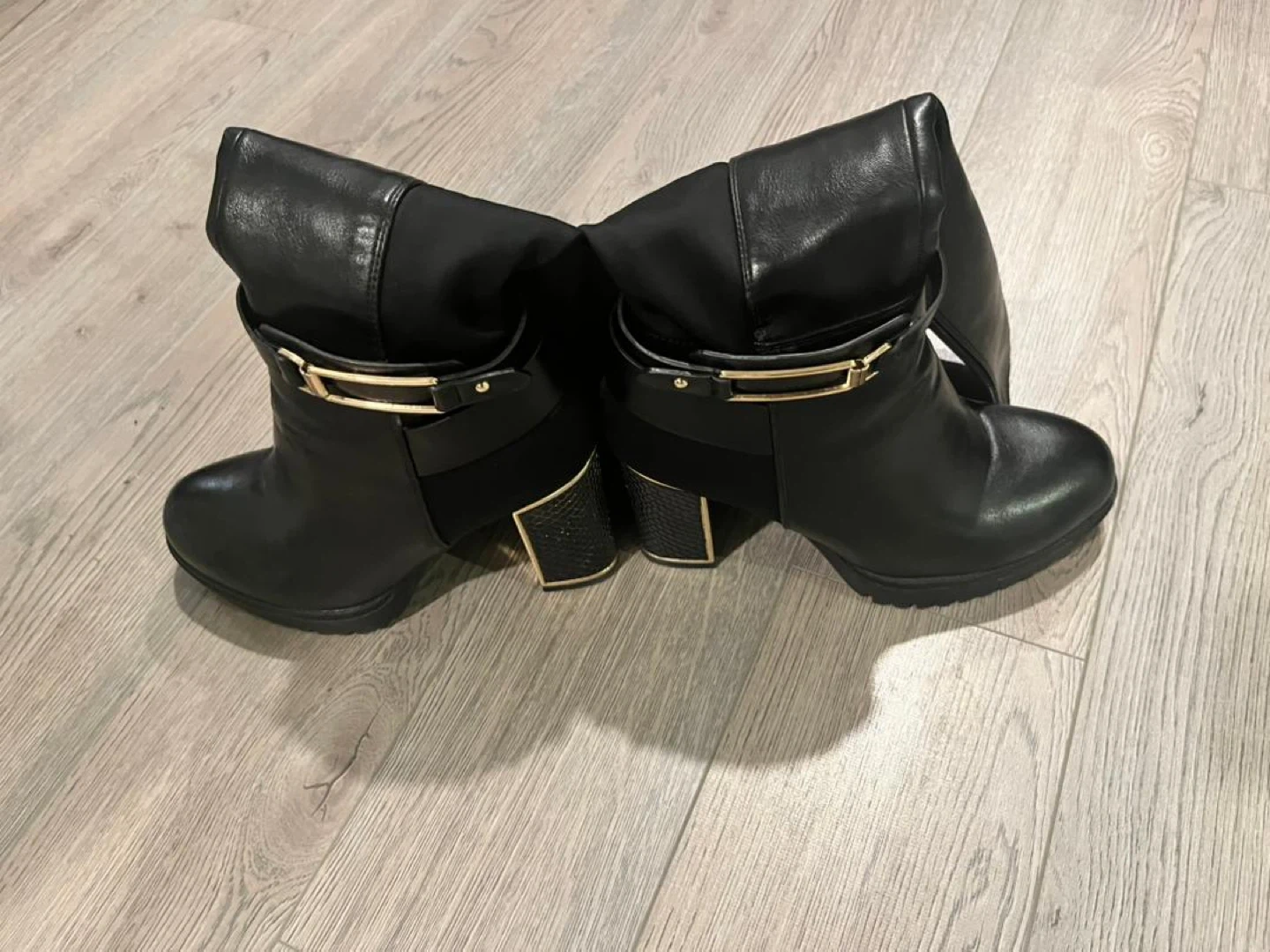 26Stylish codia black leather winter boots in great condition! These boots feature a unique heel design and are a size 40. Heels are 4 inches and come with grip soles for the winter. Perfect for adding a touch of elegance to any outfit!