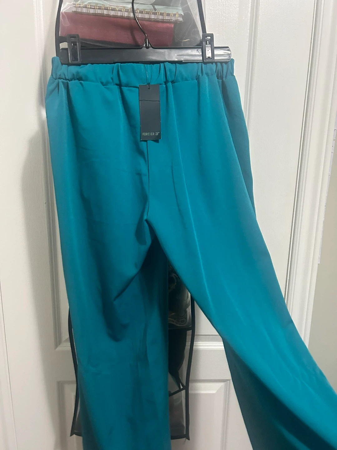 Selling a pair of teal pants from Forever 21! They're in great condition and ready for a new home. These pants are perfect for adding a pop of colour to your wardrobe