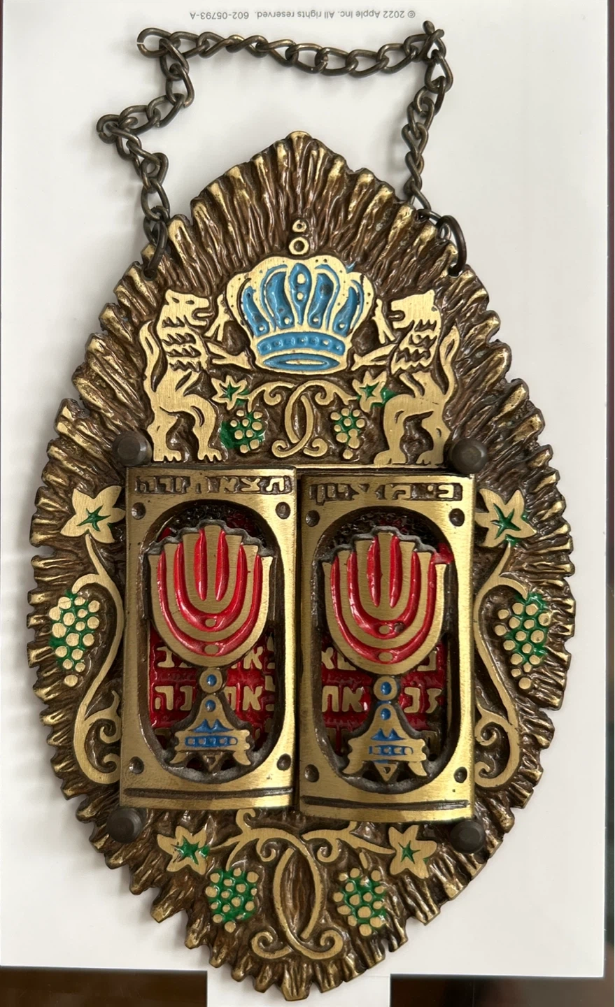 Here's a beautiful vintage wall hanging with original chain to hang. It features the Ten Commandments and has a lovely, ornate design with a gold-tone finish. It would make a unique addition to any home! Made in Israel. In excellent quality and condition. Make sure to check out all pictures provided. Smoke/Pet free home. Cash & Pick Up only.