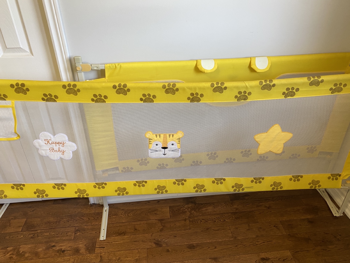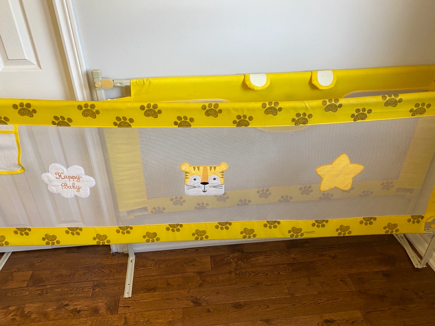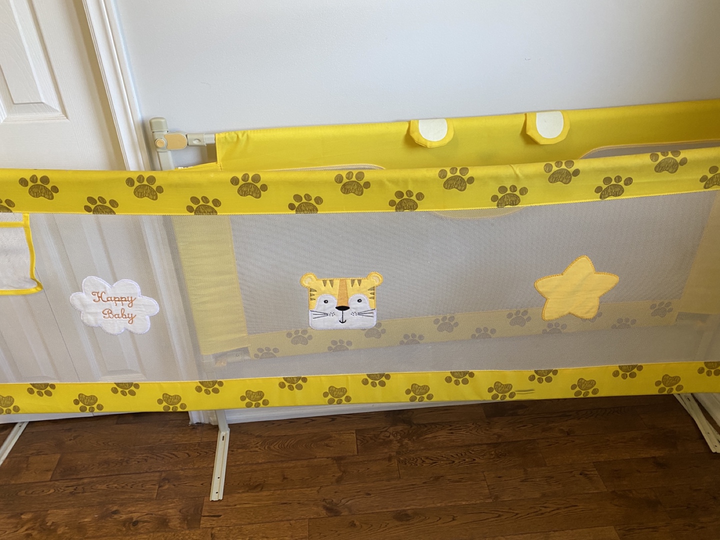 Keep your little one safe and sound with this Happy Baby bed rail! It's in great condition and features a fun yellow design with cute paw prints, a tiger face, and a star. Perfect for transitioning your child to a bigger bed