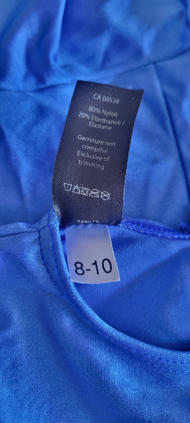 Selling a beautiful blue figure skating / dancing dress. It's made of 80% nylon and 20% elastane. The size is 8-10. Perfect for practice or performance!