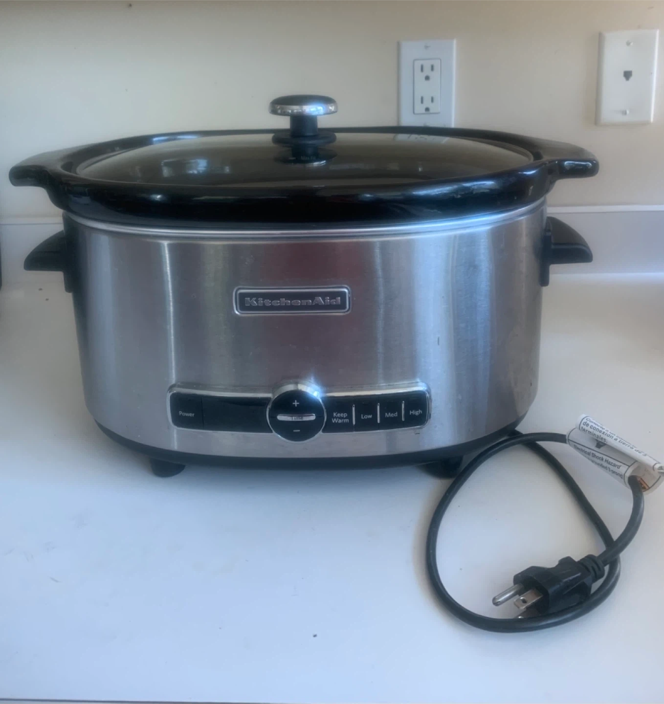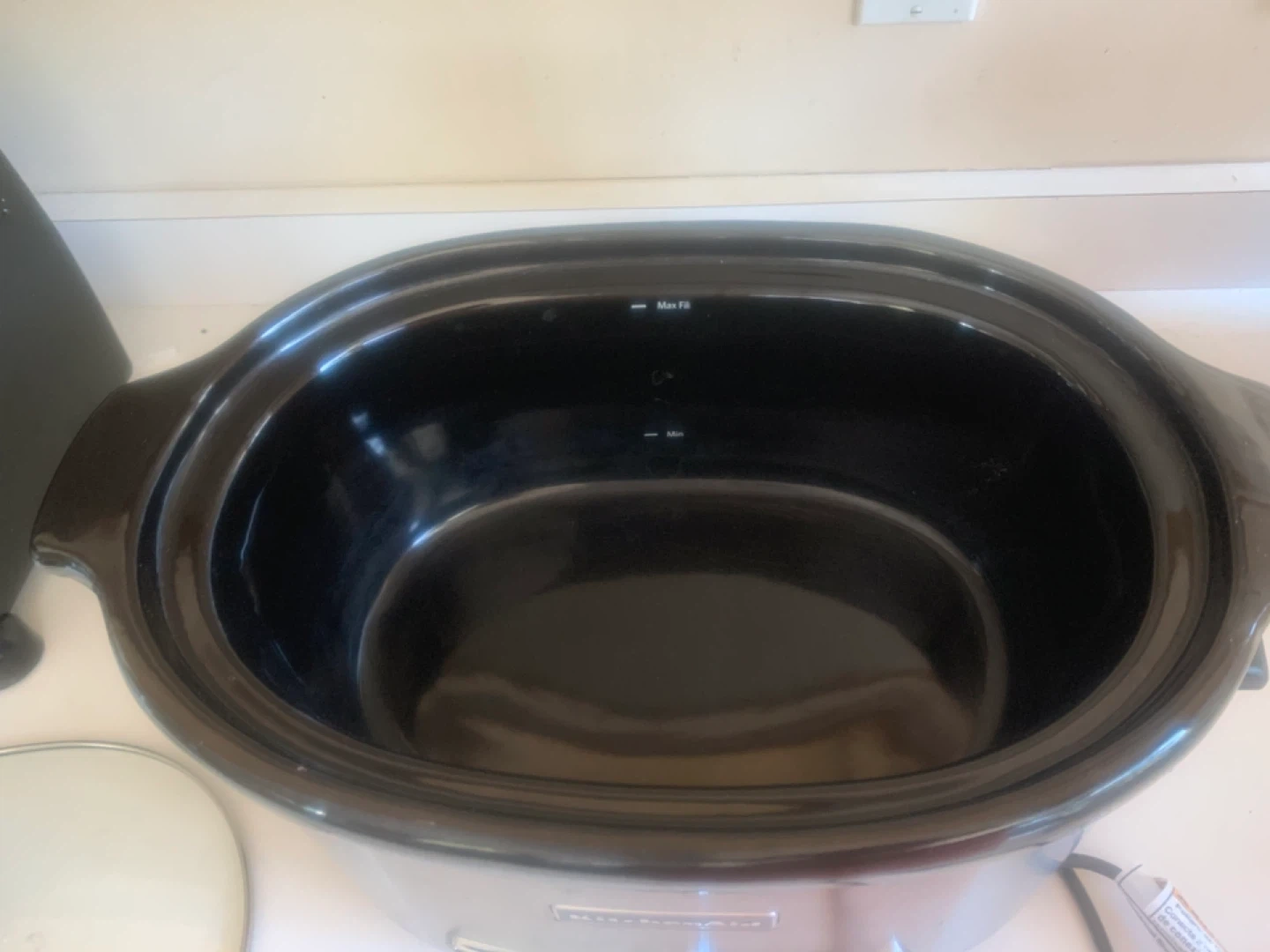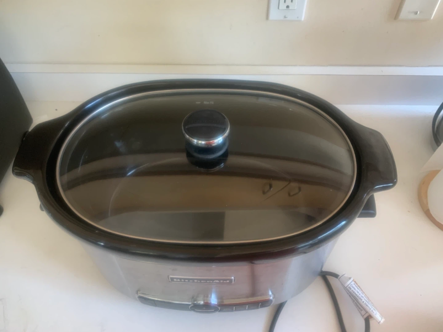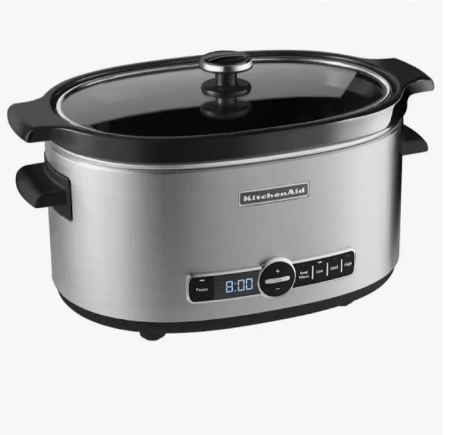 KitchenAid Slow Cooker with Solid Glass Lid, 6-quart, with a removable, oval-shaped ceramic vessel. It's in great condition and ready to use for your next delicious meal! It features a digital display and multiple cooking settings. Pick up at Eglinton Ave east at Bayview.