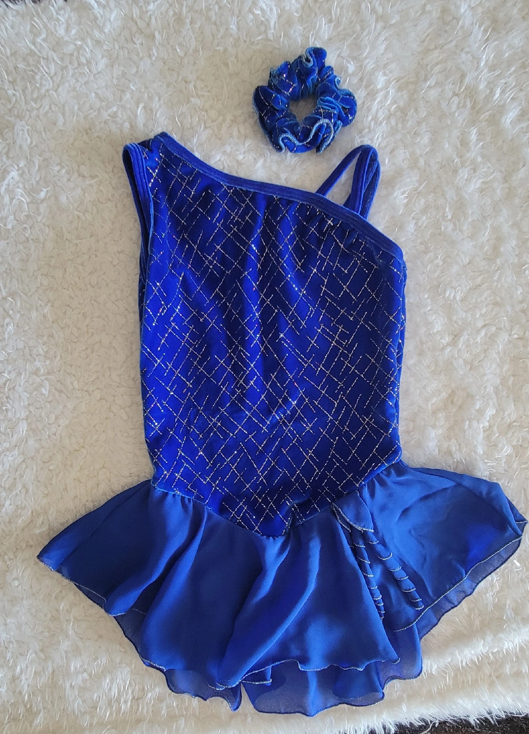 This is a beautiful blue dancing / skating dress from Jerry's! It's a youth size 8/10 and made from 90% polyester and 10% spandex. It also comes with a matching scrunchie!