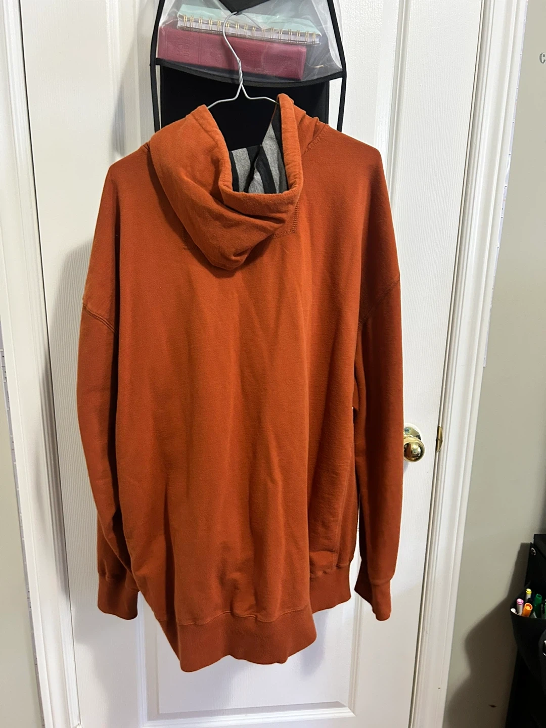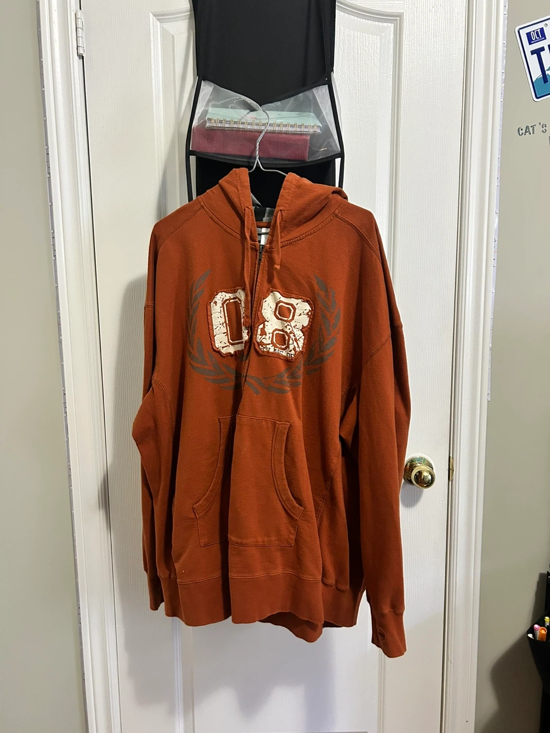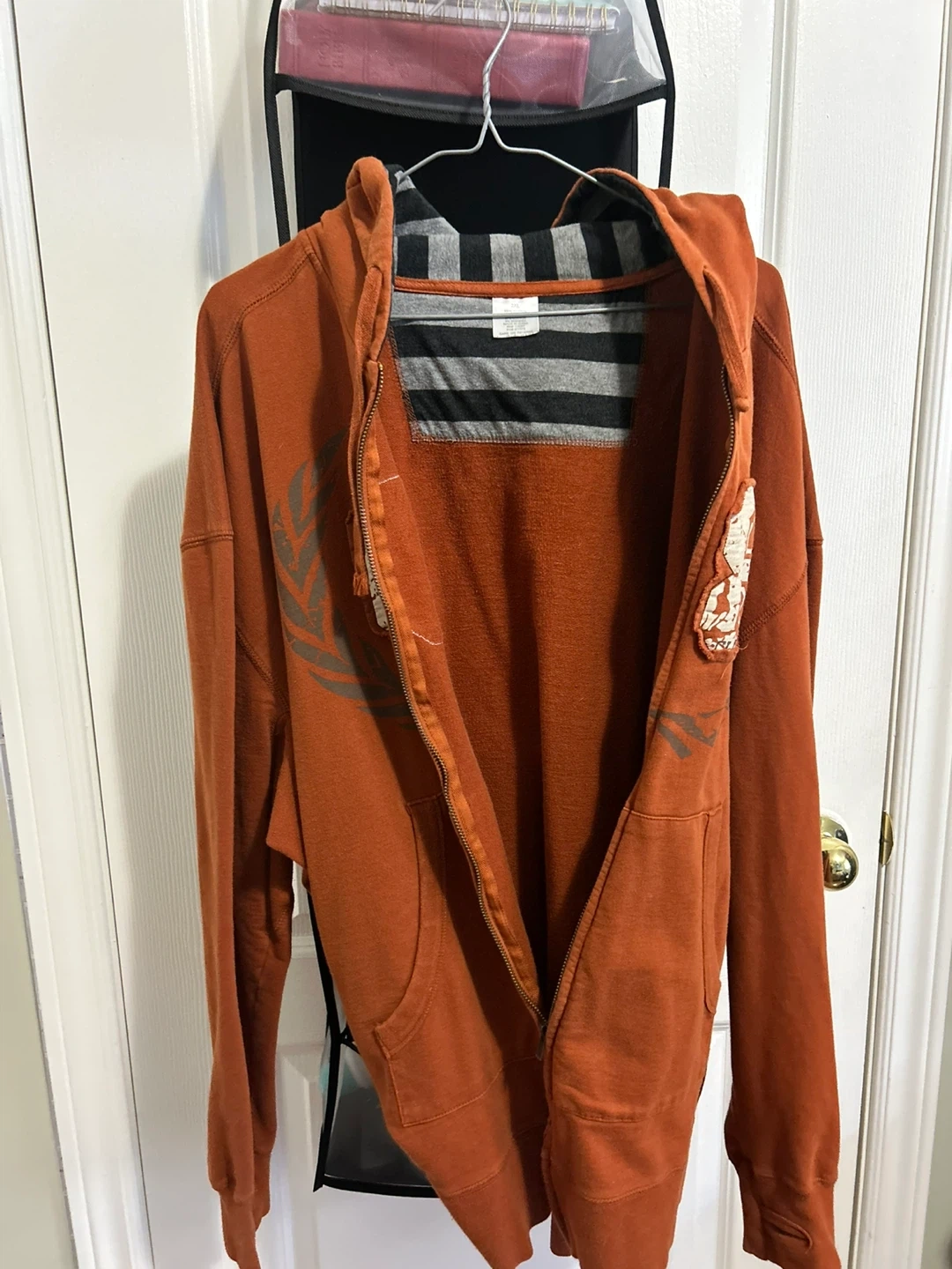 Selling a comfy orange hoodie, perfect for chilly days! It's got a zip and a cool design on the front. It's in great shape and ready for a new home