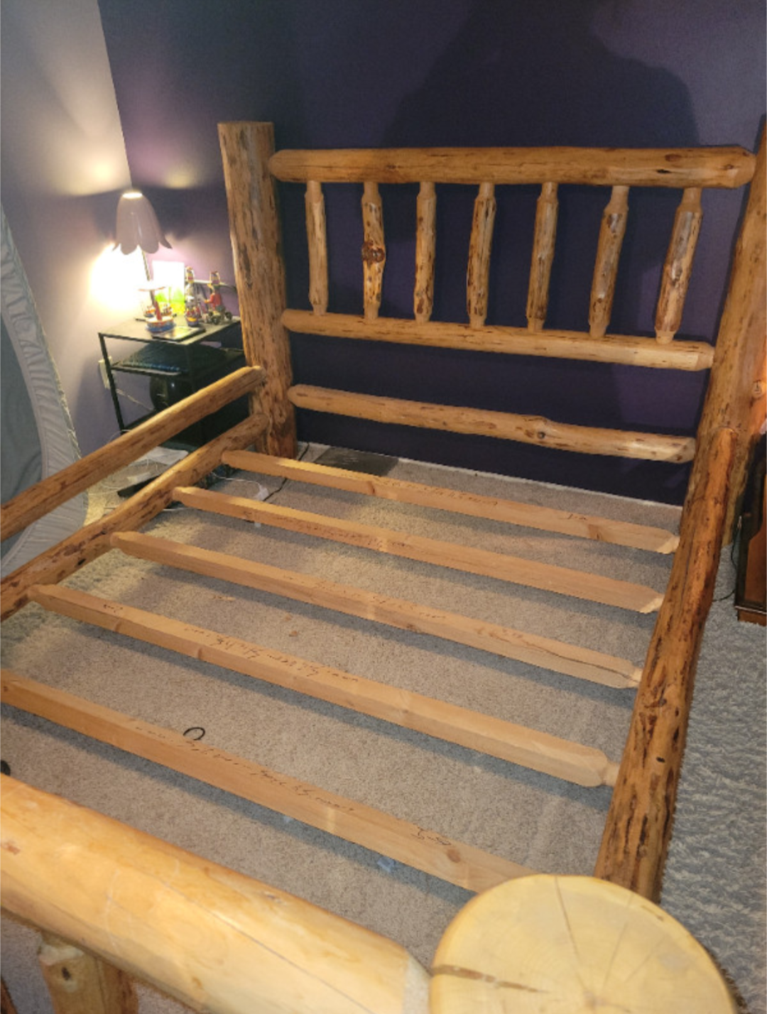 one of a kind log bed frame hand made by silver-sticks. easy assembly with 1 person. sleeps a queen mattress easily. dissembles the middle pieces, head and foot are 1 piece per. 1700 OBO