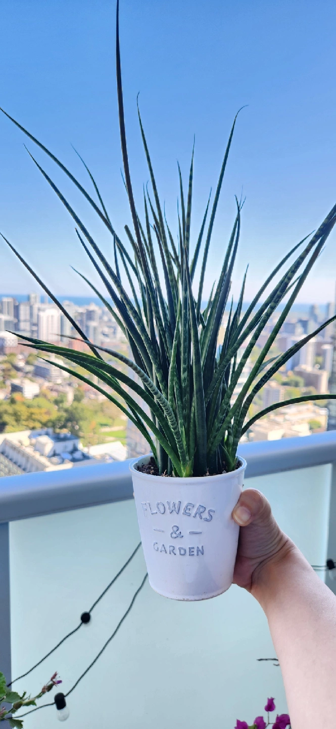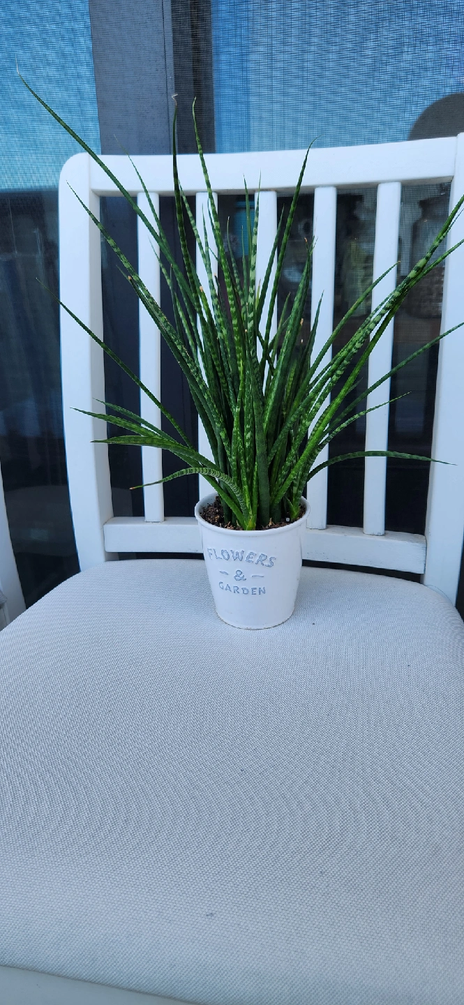 I'm selling a healthy snake plant potted in a cute "Flowers & Garden" decorative pot. It's perfect for adding a touch of greenery to your home or balcony! A really good choice for beginner gardening enthusiasts or of you keep forgetting to water your plants!