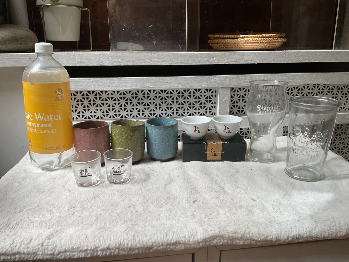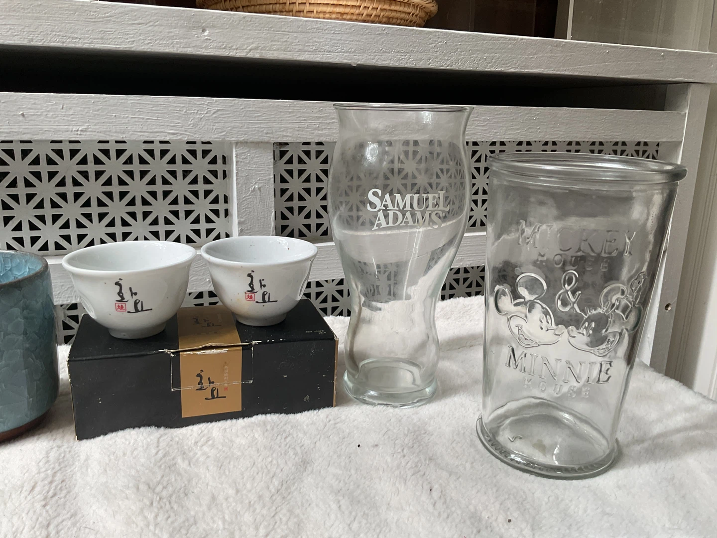Beer cups and also Japanese tea or sake cups mugs with textured finishes in brown, green, and blue, and glasses including a Samuel Adams pint glass and a Mickey & Minnie Mouse glass. Great for adding variety to your drinkware collection!