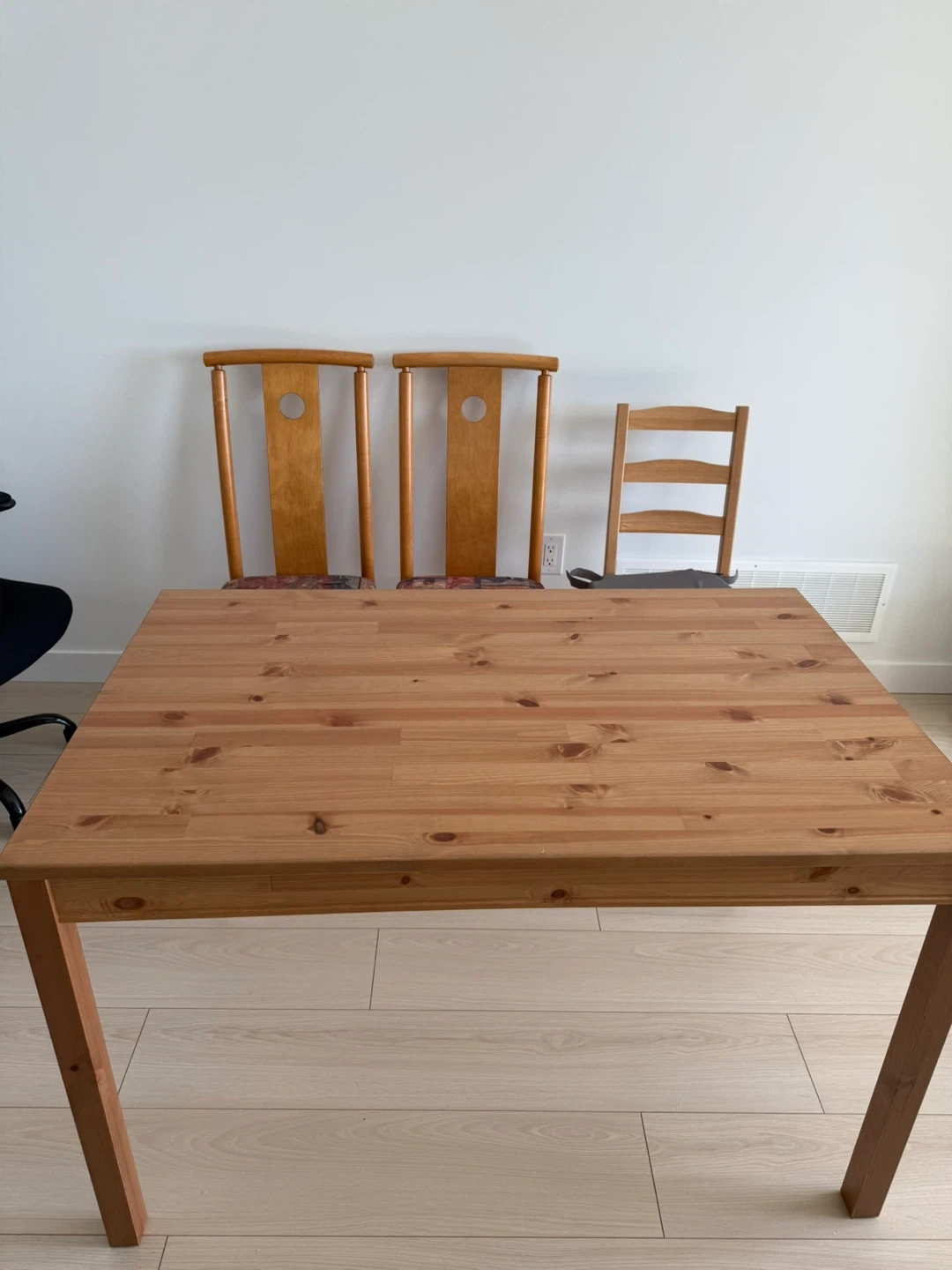 Selling a solid wood dining table, perfect for a kitchen or dining room! It's in great shape and ready for a new home. The natural wood grain adds a warm touch to any space. It's sturdy and reliable for everyday use