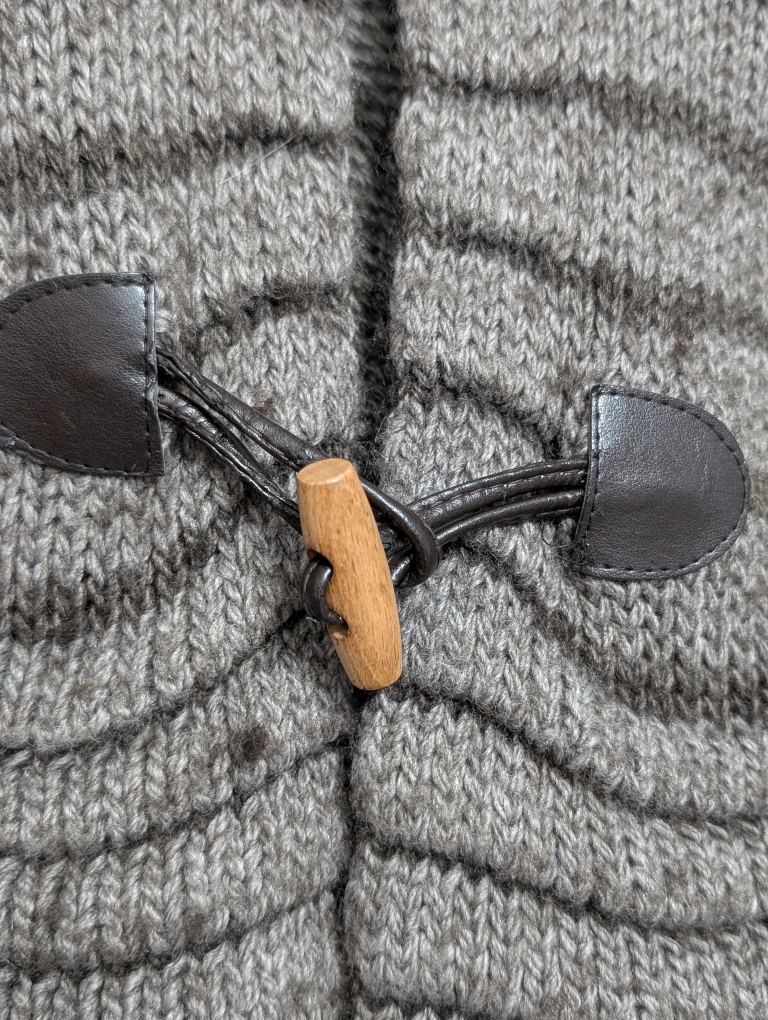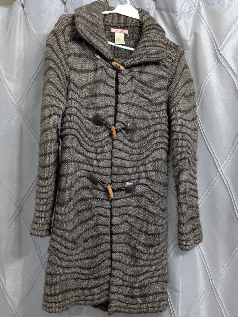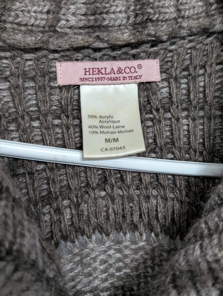 Cozy up in this stylish cardigan from Hekla & Co.! It's a size M and made in Italy. The material is a blend of 50% acrylic, 40% wool, and 10% mohair, making it super warm and comfortable for those chilly days