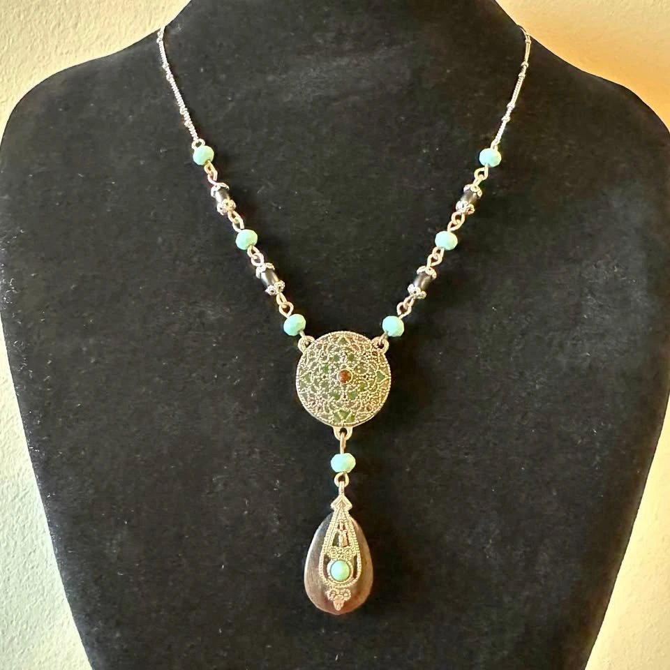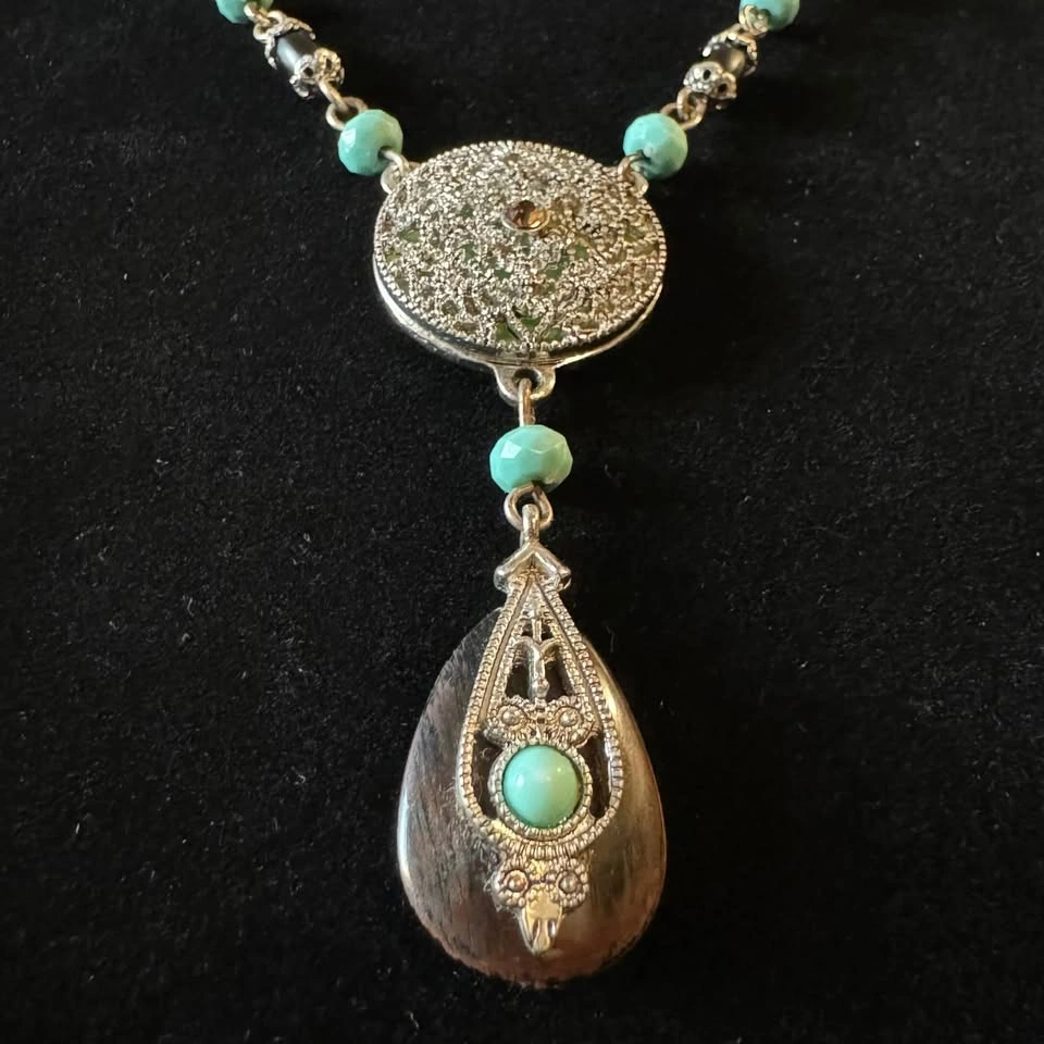 Vintage Nina Ricci for Avon necklace 🩵🤎 Beautiful silver tone necklace with wood-like and black/turquoise coloured beads (possibly lucite) in lovely vintage condition—lovely filigree medallion pendant that looks like a dreamcatcher! Vintage Nina Ricci for Avon Has the NR hallmark of Nina Ricci for Avon. Signed NR on the back of the pendant and is likely from the 70s/80s. Let me know if you have any questions or require more photos/videos. Photos/video were taken by the window in evening light.