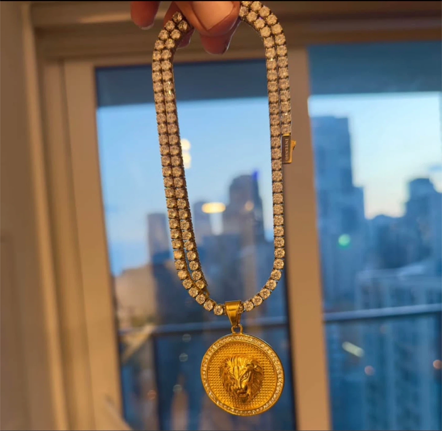 Base metal 304 stainless steel, coated in pure 18 K Gold, Tennis chain, set with Natural AAA grade Zircon, and Lion pendant set with Zircon.