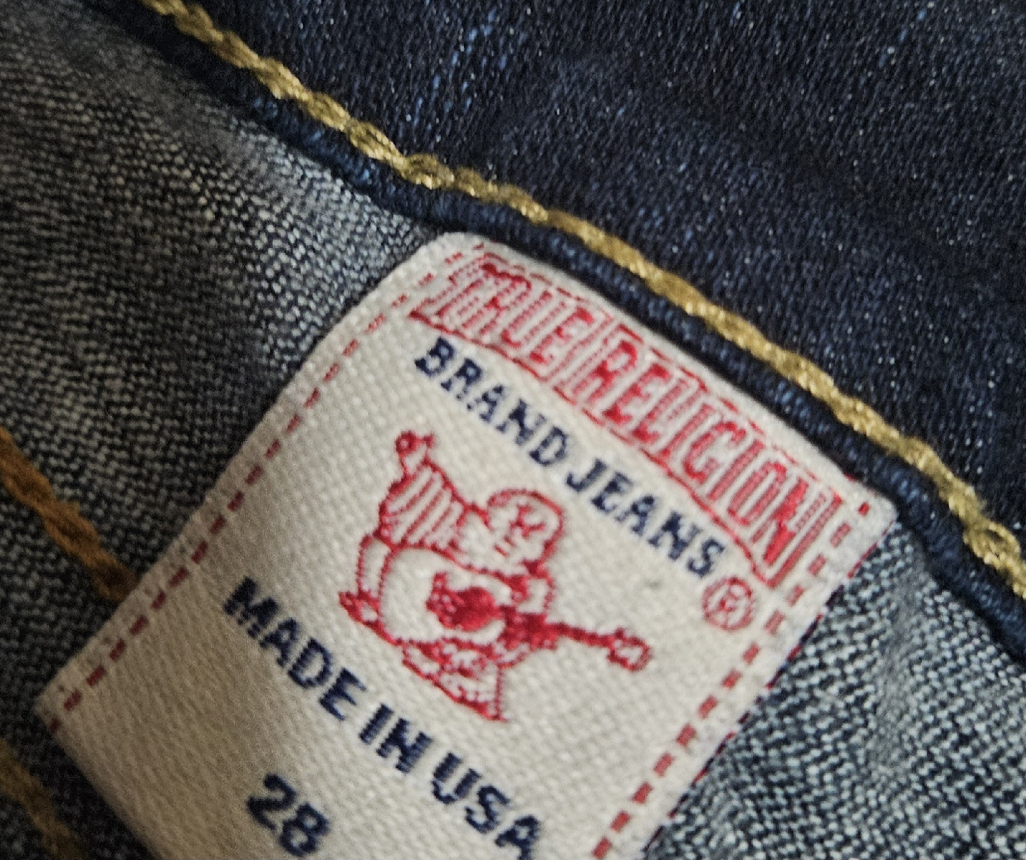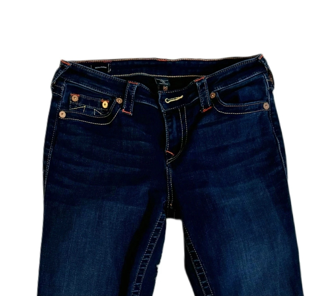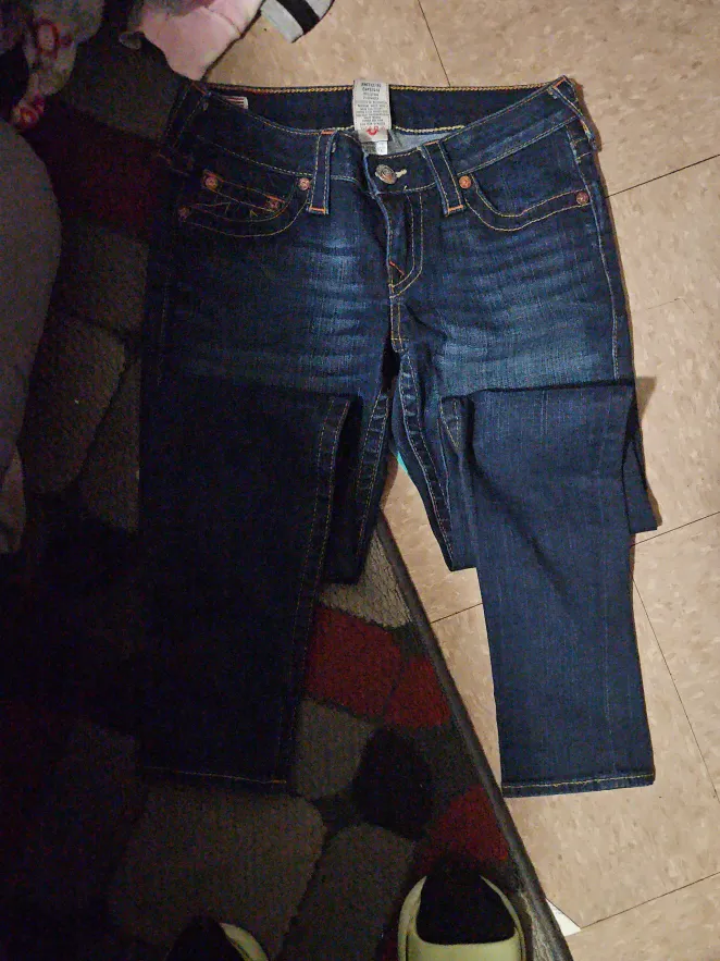 Selling a pair of True Religion jeans in a dark wash denim! women's size 28 Features the signature horseshoe design on the back pockets with orange stitching. Great condition and ready for a new home brand new never worn kids removed by Daughter purchased November 2025 msrp $105.