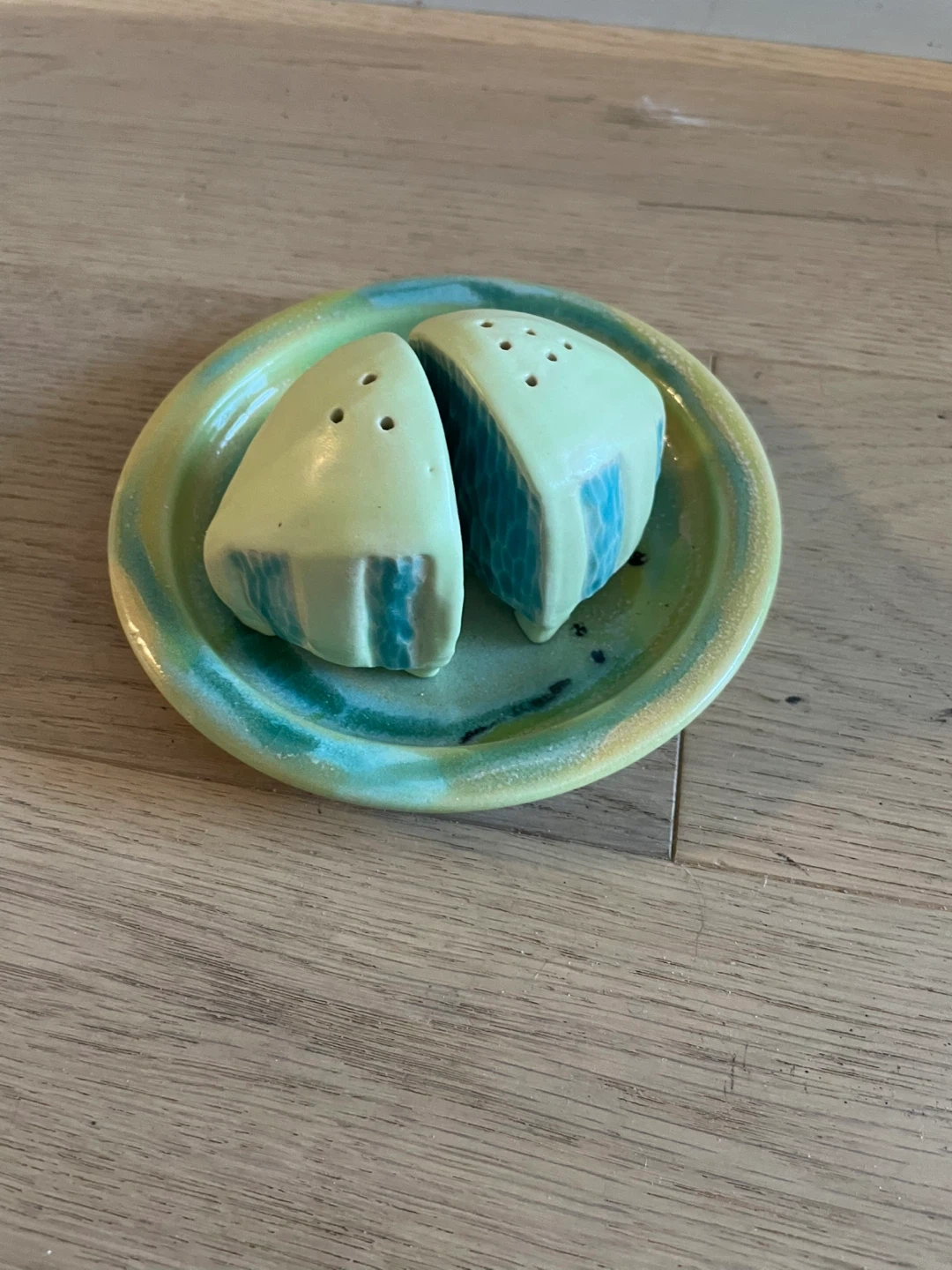 Here's a cute set of ceramic salt and pepper shakers that come with a matching dish! The shakers are a unique triangular shape with a light green glaze and blue accents. The dish has a beautiful blend of green and yellow hues. It's a lovely addition to any dining table