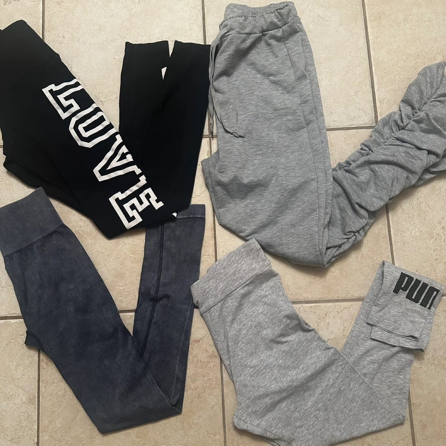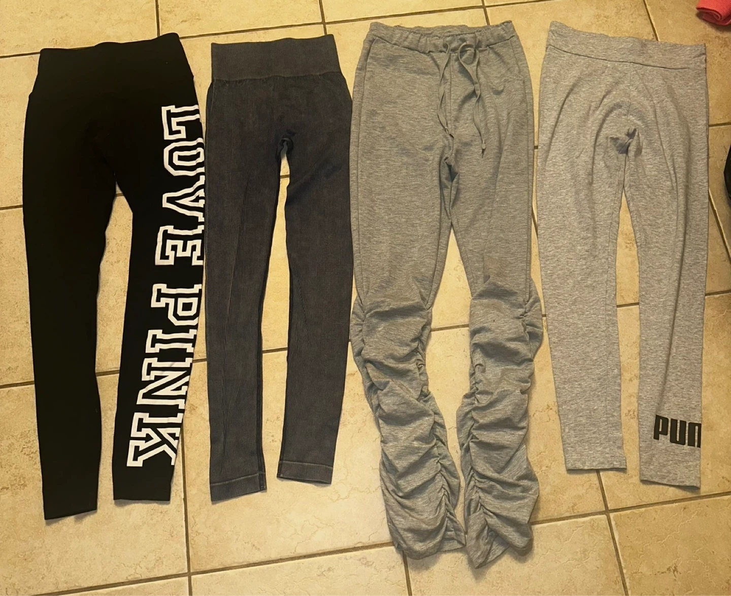 Selling a bundle of four leggings! Includes: - Love Pink black leggings with white lettering, 9" rise, 27” inseam. SIZE XS - steel blue leggings, 10" rise, 26” inseam. SIZE XS-S - scrunch leg drawstring pant, 12" rise, 29” inseam. SIZE SMALL - Puma light grey leggings, 10” rise, 26” inseam: SIZE SMALL