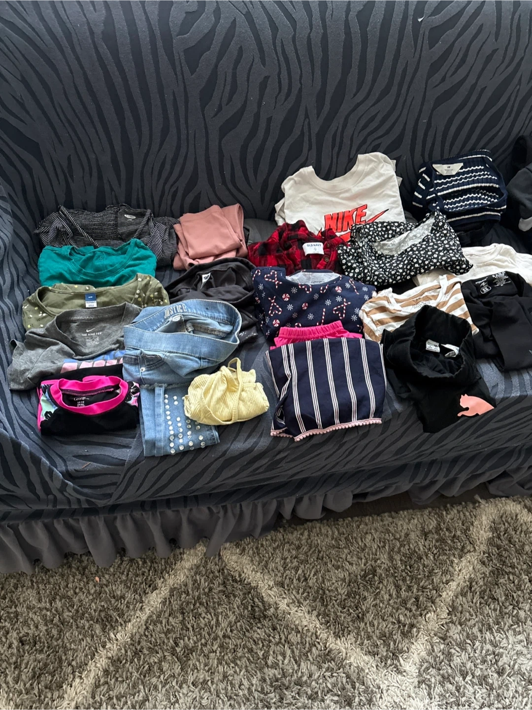 68Selling a big bundle of girls' clothes! There are various brands like Nike, Old Navy, H&M, Justice, and George. Included are tops, bottoms, dresses, and more in different colours and patterns. Great for stocking up!