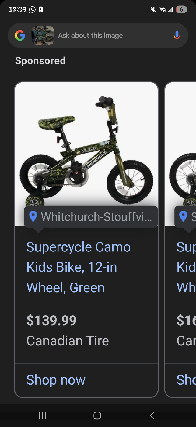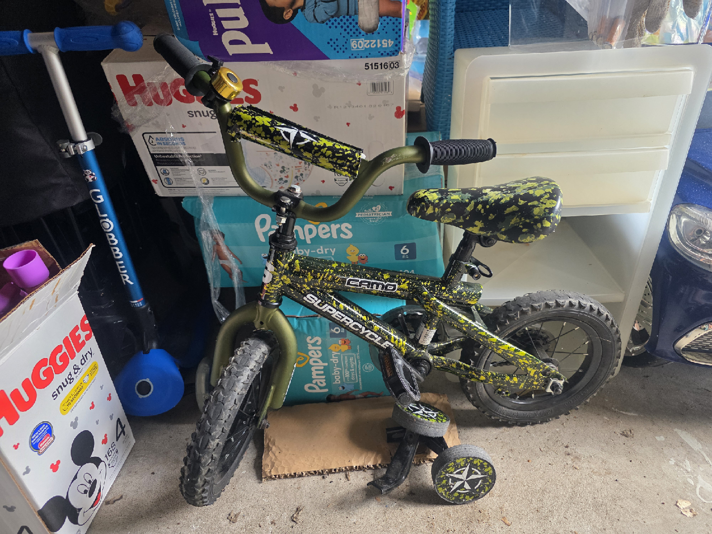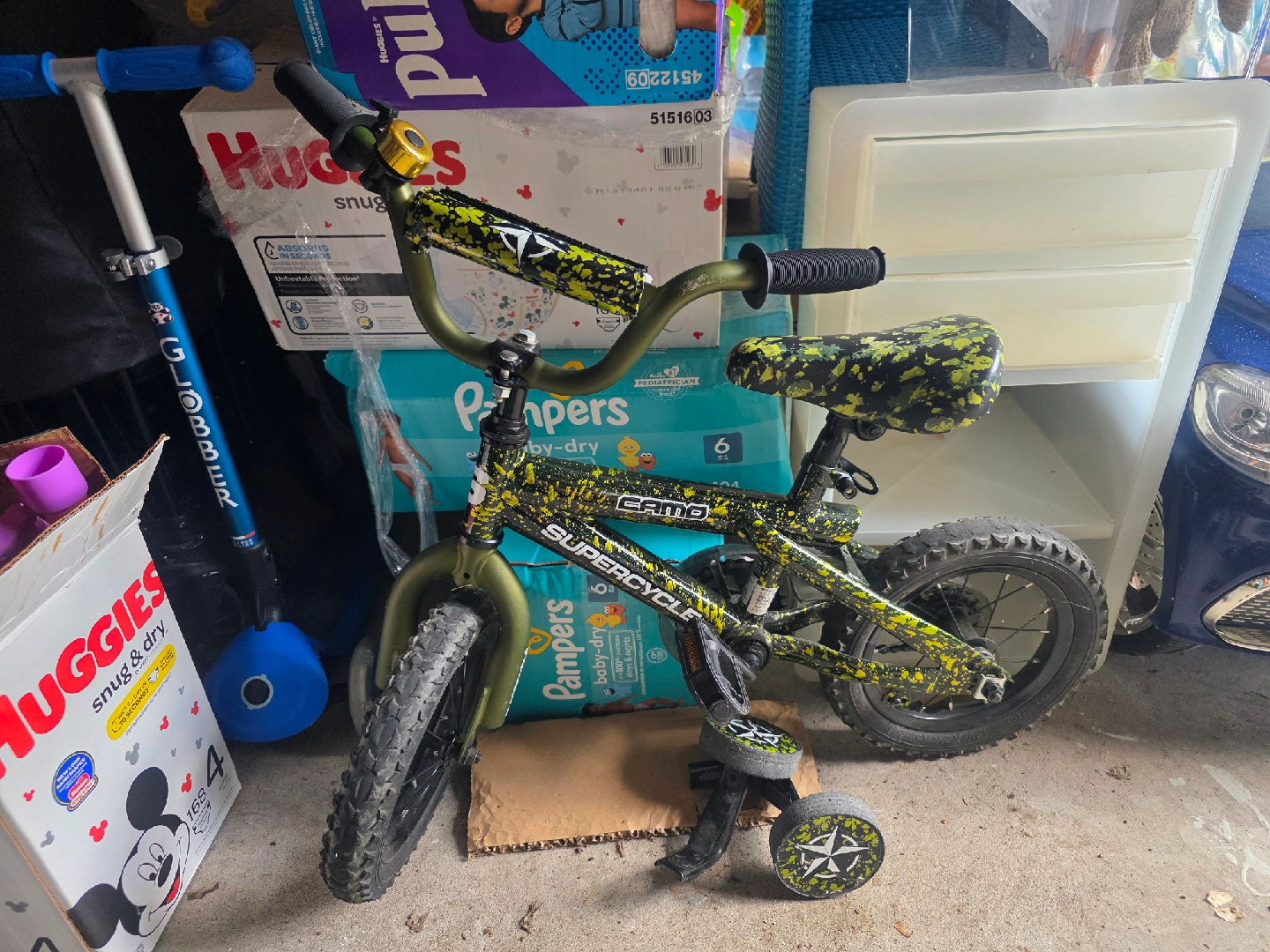 Selling a Supercycle Camo kids bike with 12-inch wheels in green. It's a great starter bike for young children learning to ride. Originally bought for $139.99 at Canadian Tire!