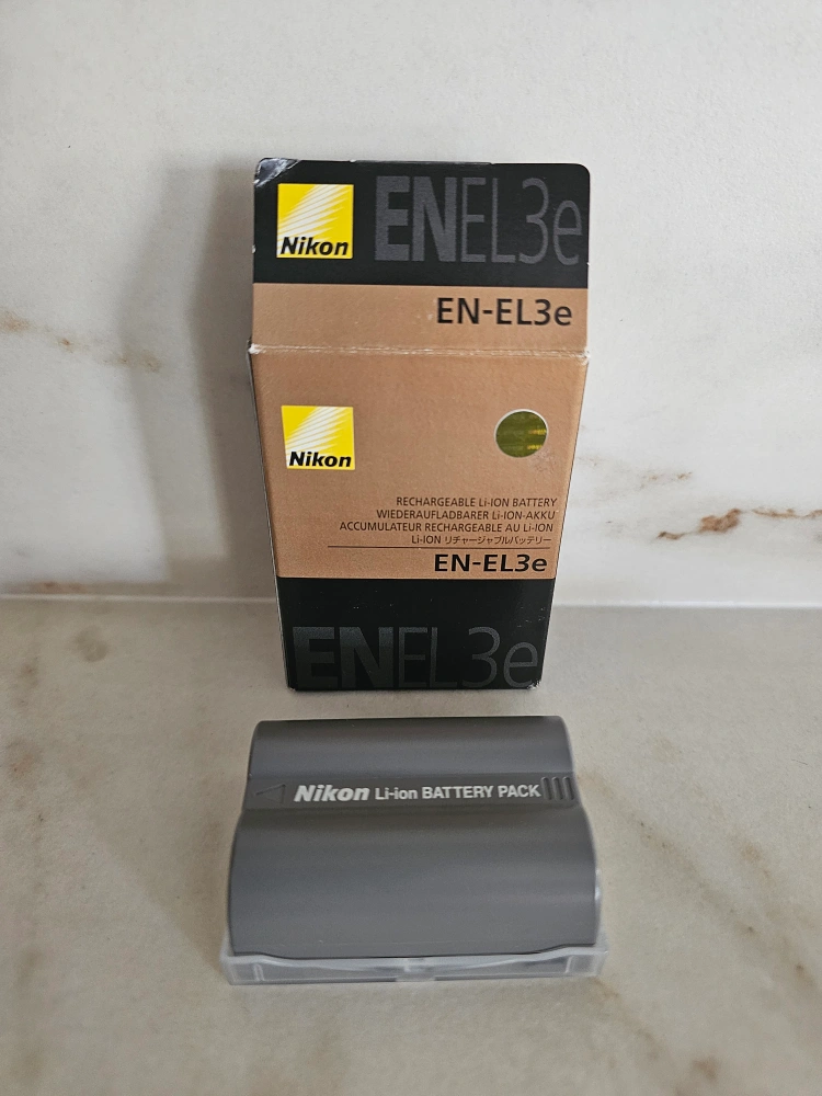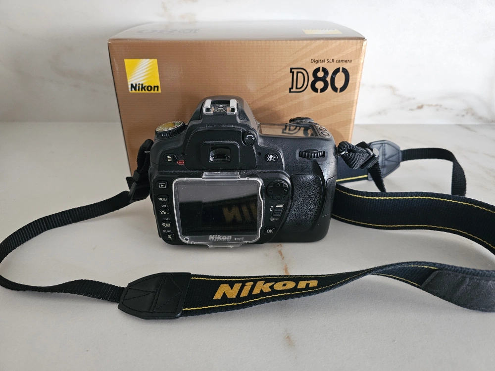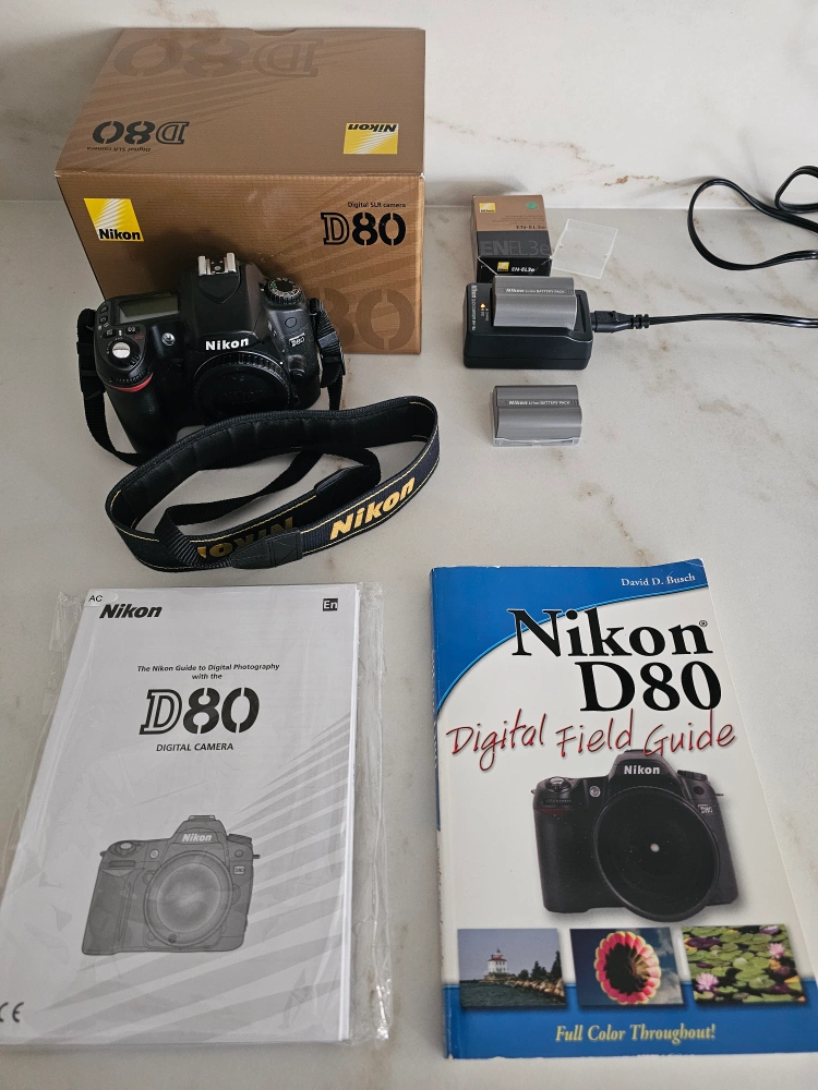 Selling a Nikon D80 digital SLR camera body that needs repair. It gives Err code, as the mirror is stuck in the up position. It comes with the original box, extra EN-EL3e battery, charger, strap, and user manual. Batteries are in new condition.